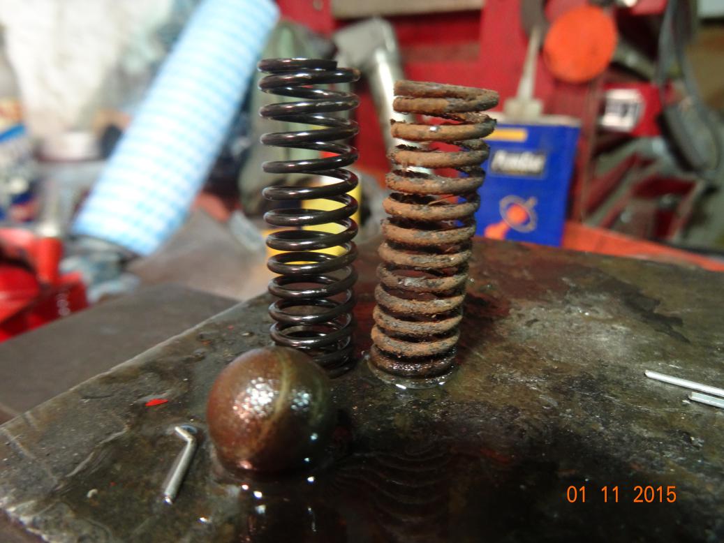 The old and new pressure relief valve springs and a rusty ball.
