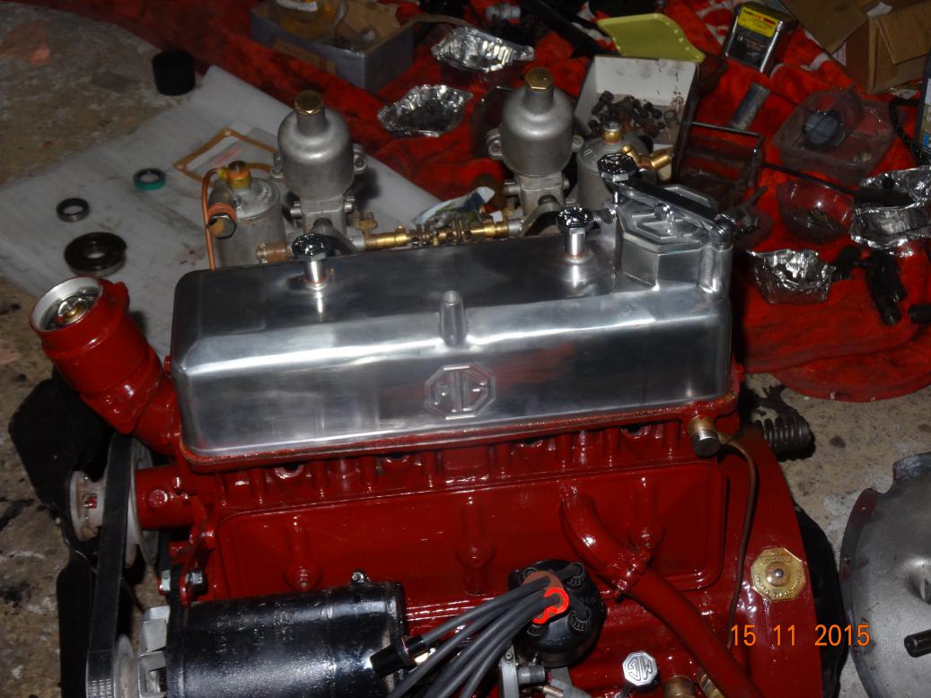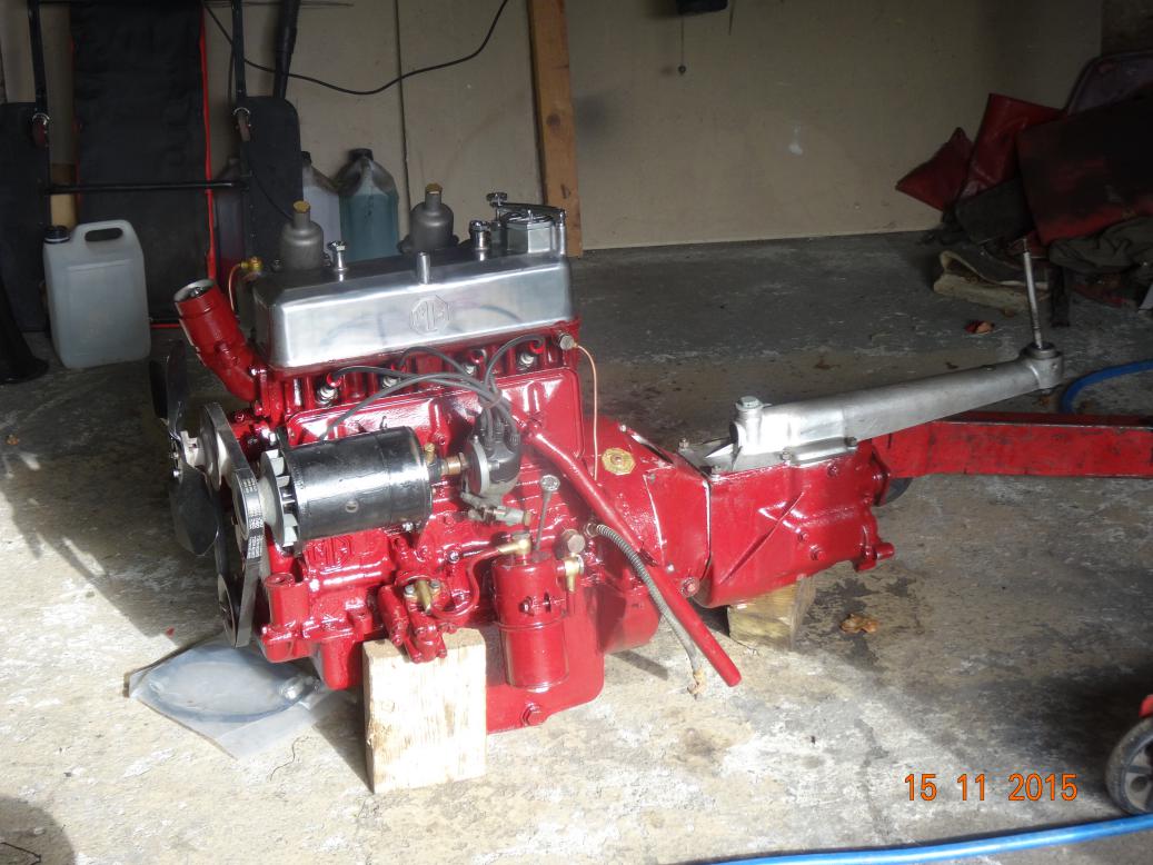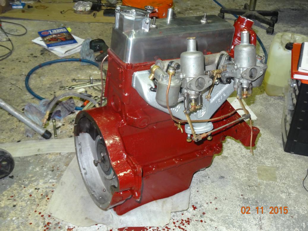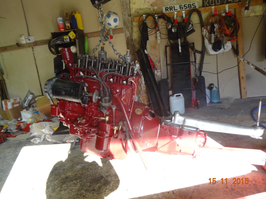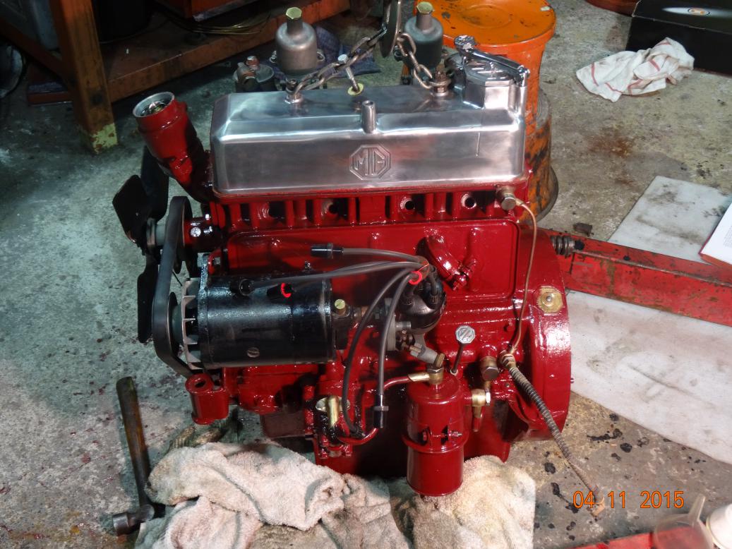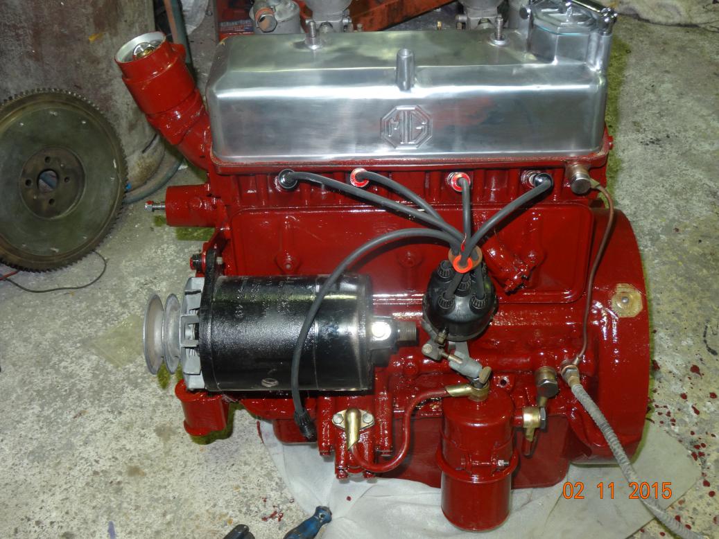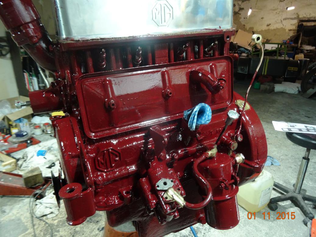 So, tonight the engine is almost complete and painted. I'll touch it up tomorrow, painting the bits I missed and then clean the overpainting off the bits that shouldn't have paint (rocker cover and brass unions). I have to clean the oil pipe union bolts then fit all the oil pipes. Then I'll fit the manifolds, carbs, starter and dynamo.