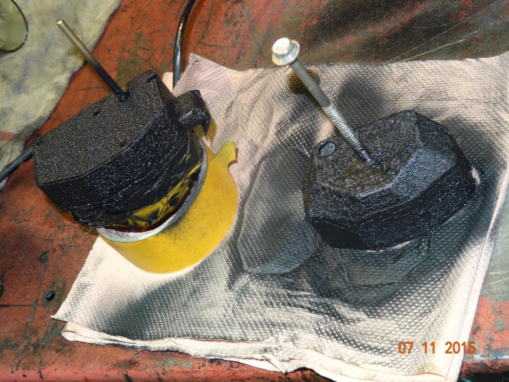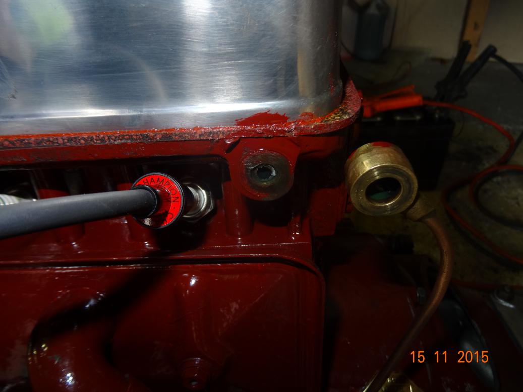 Went out and did a bit of shopping first thing (if 1000 is first thing). got back and changed and started work at 1200. Gave the engine a second coat and left it under 2000 watts of floodlights to dry. After lunch removed the water jacket core plugs to clear/drill out the bypass holes. I couldn't find the one in the rear but when I put a 3mm drill in it went straight into the soft silt blocking the hole. However the front one didn't have a hole so I drilled one. After refitting new core plugs it was the manifolds next. I wanted to straighten one of the new studs in the downpipe so I heated it to bend straight. It was only a small fire. I had a little tray of thinners on the bench to clean the paint brushes and it caught fire. It was fine until I tried to put it out by smothering it with some cloths but they caught alight. I pushed the whole lot onto the floor and threw a towel over it, which put it out. Went back to the bolt and straightened it. I found the manifold retaining brackets and nuts and fitted the manifolds. Then I had to make two studs and longer bolts for the carbs to inlet manifold because I've fitted heat shield blocks. Took a while to get it right, then all the oil pipes and filter went back on and lastly the dynamo is on, but not tight. I won't fit the air cleaner because I will have to take it off to set the carbs. I can't fit the starter until I've got the flywheel in. I will have to cut and drill the broken fan blade screws from the fan pulley then the pulley can go on, fan belt and dynamo can be tightened.