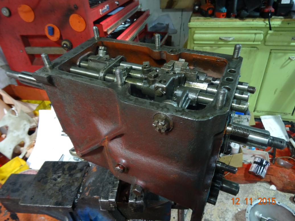 Started at 0800 and took the lay shaft and main shaft out. Refitted the balls and springs to the hub. Wish it was as easy to do as to say. But I got it at the 6th attempt and 2 lost balls. Luckily I'd ordered 6 new ones so had a few spare, there being only one of the original six missing. Then refitted main and lay shafts. Sorted out the selector rails and just skimmed the first/second rail on the grindstone as it wouldn't push through the fork. I refitted the end cover and the final drive flange. Then took it all off again to fit the two balls that do not have springs. I looked up several documents to establish where they went as "I saw not wereth they falleth from". Even though I'd previously looked at the holes in the casing, when I looked again with a bright torch I saw they went between the rails in sideways holes where the balls with springs go in the vertical plane. So, off with the end plate, fiddle the two balls in, refit the rails and refit the end plate. Then wire up the locking pins and speedo drive screws and fit the top cover. I've painted the bell housing, iron casing and end plate the maroon colour, leaving the gear lever extension unpainted. I cannot fit the bell housing until the correct oil seal arrives from Roger F. As I'm not working tomorrow (we have friends coming over) I'm hoping the bell housing seal, along with the rocker pillars arrive tomorrow. Then I can finish the engine and gearbox and put the two together.