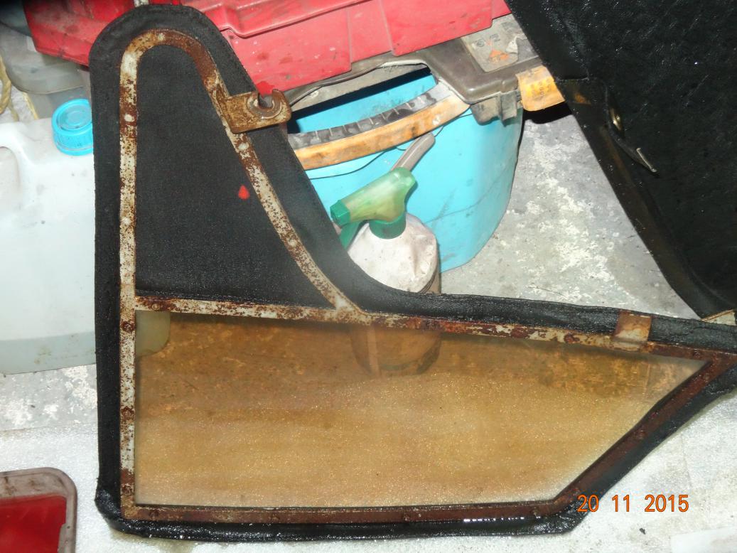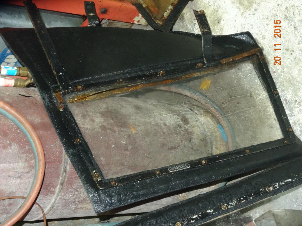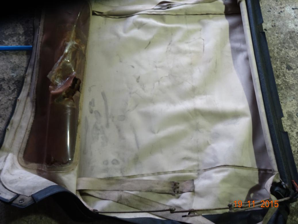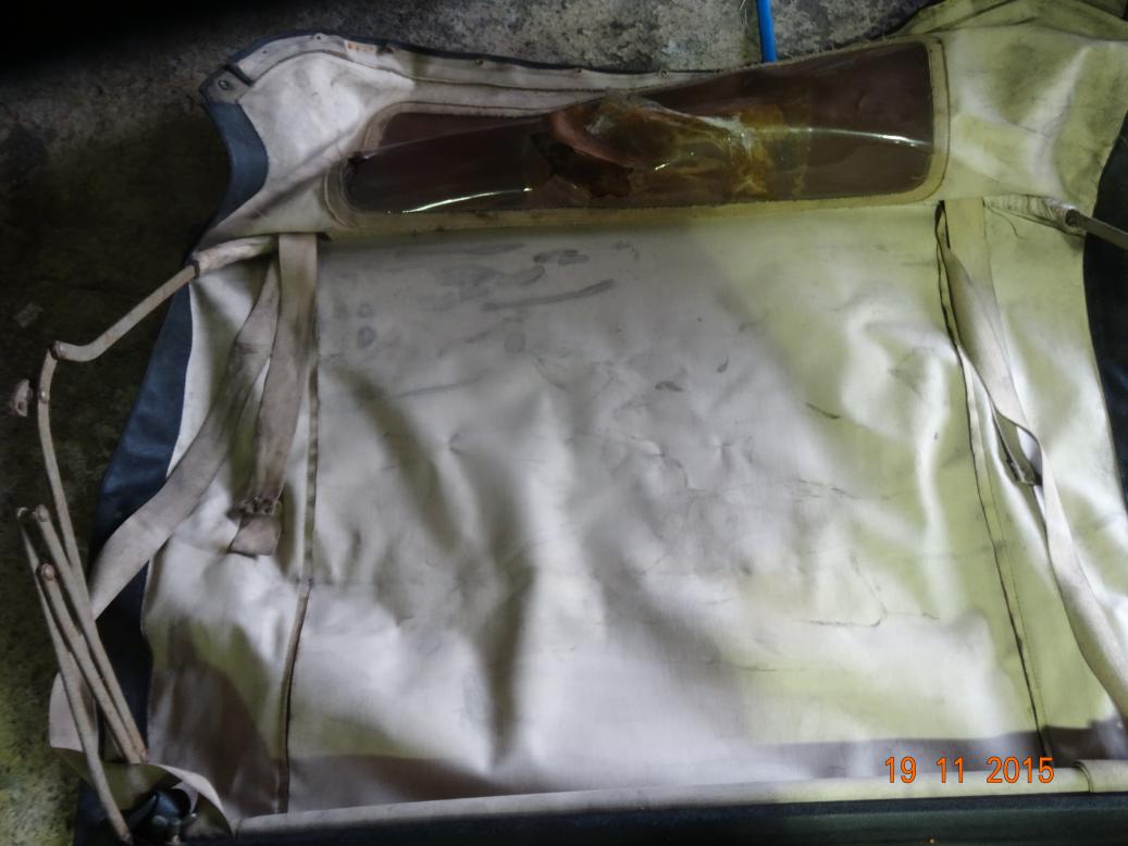 Was going to have a whole day off. However, by 1000 I was bored so brought the sidescreens and some tools into the house and started to remove the frames. Got most of the nuts off but a few were turning in the studs which are captive in the outside chrome strips. Got my Dremel but I've run out of cutting discs so that was as far as I could go. I got an email from John, the previous owner informing me that he had put a new hood and front sidescreens on during the 1960s. This explains why they are in vinyl and the rear side screens are original canvas. The rear are beyond repair, so I'll ask the chap puting the new windows in to make new, vinyl ones.