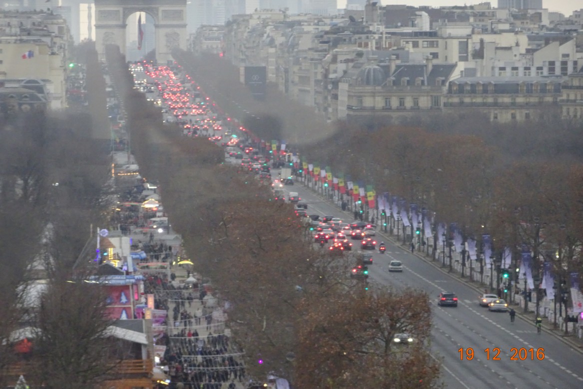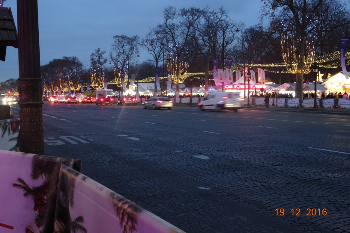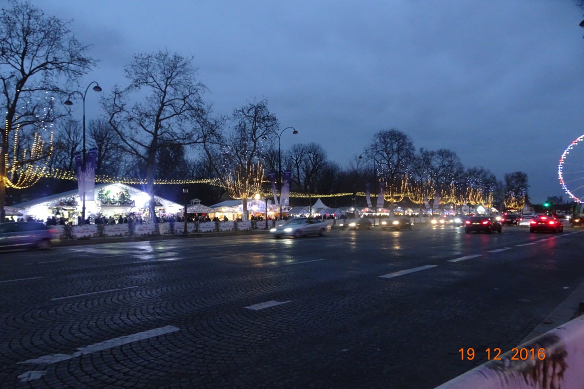 The Champs Elysee with the Christmas market on the left. The Arc de TRiumph is at the other end.
