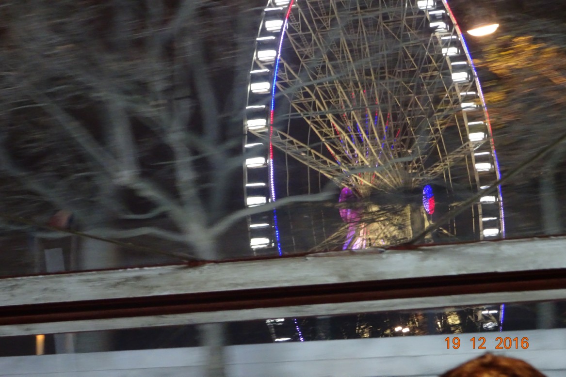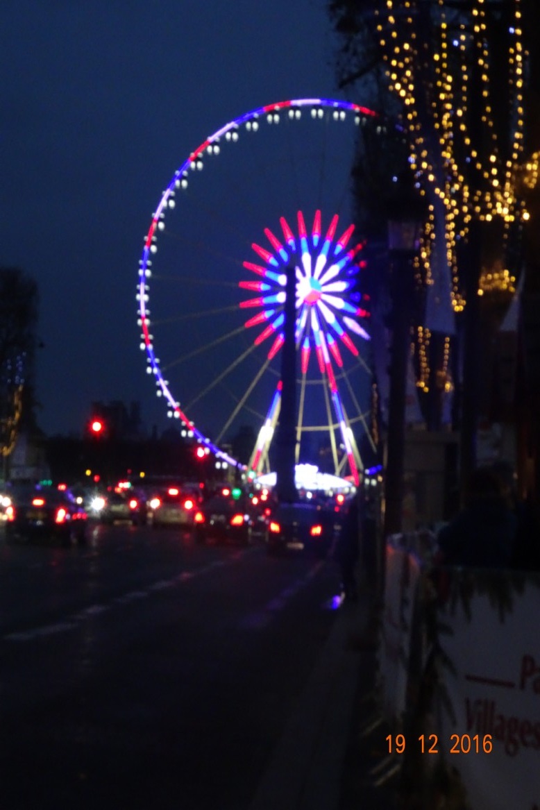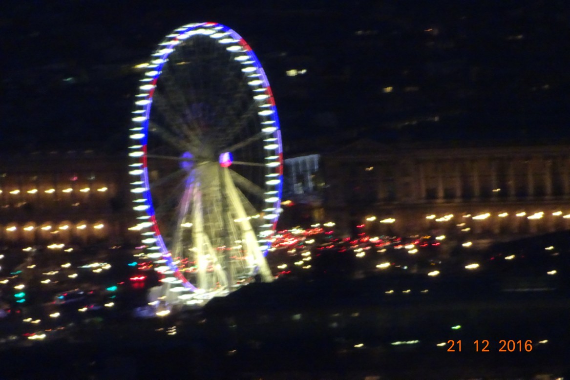 A blured picture of the wheel. It's 70 metres high and dominates the city at night, as does the Tour Eiffel.