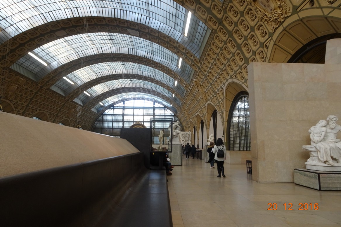 This picture, of the downstairs, with scuplture in the center and small galleries on either side shows that the Museam was previously a railway station.
