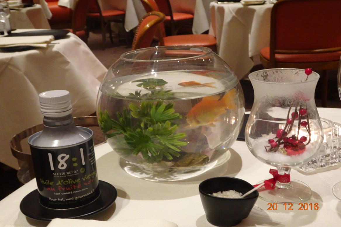 The goldfish bowl on our table at the restaurant, "The Citroen Etoile". I couldn't decide whether to have it grilled or fried. The American owner, a 50 year old very good looking, tall lady came over and I suggested she make up small fishing rods and dangle a piece of cotton in the bowl. She thought it wa a great idea and said she's use some chopsticks. Bet she forgot about it 30 seconds late.