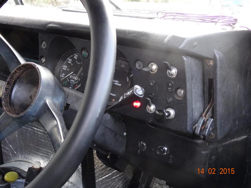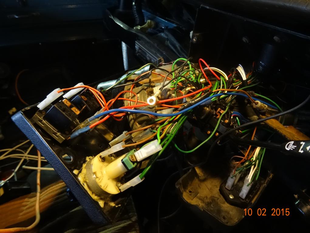 The red light on the dash (just under the indicator stalk) is the reverse lamp warning light. The bottom toggle switch is: Reverse lamps to the right (where it is now) and spot lamps to the left, all off in the centre. The button to the right of this switch is the starter button. The top right switch is a normal light switch off-side-head. To the left of that is the switch off-dash lights-interior light. The coil of wire for the interior light can be seen on the dash top.