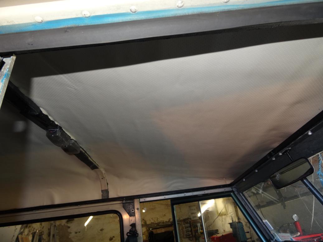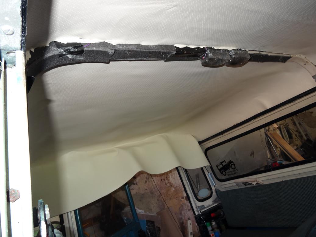 Headlining at the front. Very difficult because the roof isn't "square". The ripples should straighten over time. I've yet to cut a strip for the roof bar.
