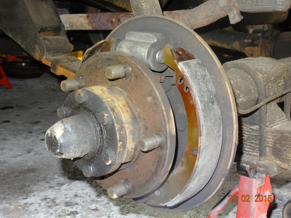 This morning, 23rd January, Lynne and I cleared all the stuff out from the wall opposite the workshop doors and got the Land Rover in so I could get all four wheels off. We then jacked it up on axle stands, got the wheels and drums off. I found the o/s/r had axle oil on the shoes. This was surface only so I cleaned off with white spirit (until clean cloth stayed clean). Then roughed up the shoes with a wire brush in a drill.