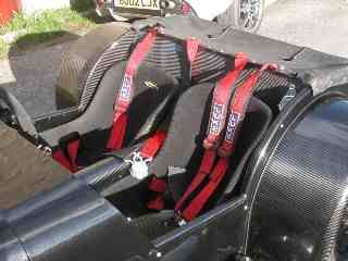 First Tillet seat in position on half carbon floor. It was at this point that impatience got the better of me and I took car up the road to try new seat. I had bonded the nearside carbon wing on a few hours earlier. The polymer wasn't set, the wing flew up and landed in front of the car and I RAN OVER IT!