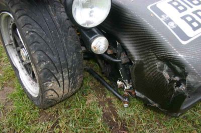Ooops, where's the shocker top gone? Miracle seems to be that the front wing