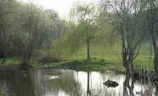 So, due to a lack of rain and extensive sunshine during 2005 (good for us) this picture shows the pond with no water and very dried out (bad for ducks). We hope that we get some rain during the winter to refill it.