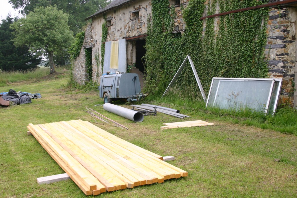 June 9th sees me getting the wood and windows out of the barn onto the grass outside. The whole lot are mounted on two battens