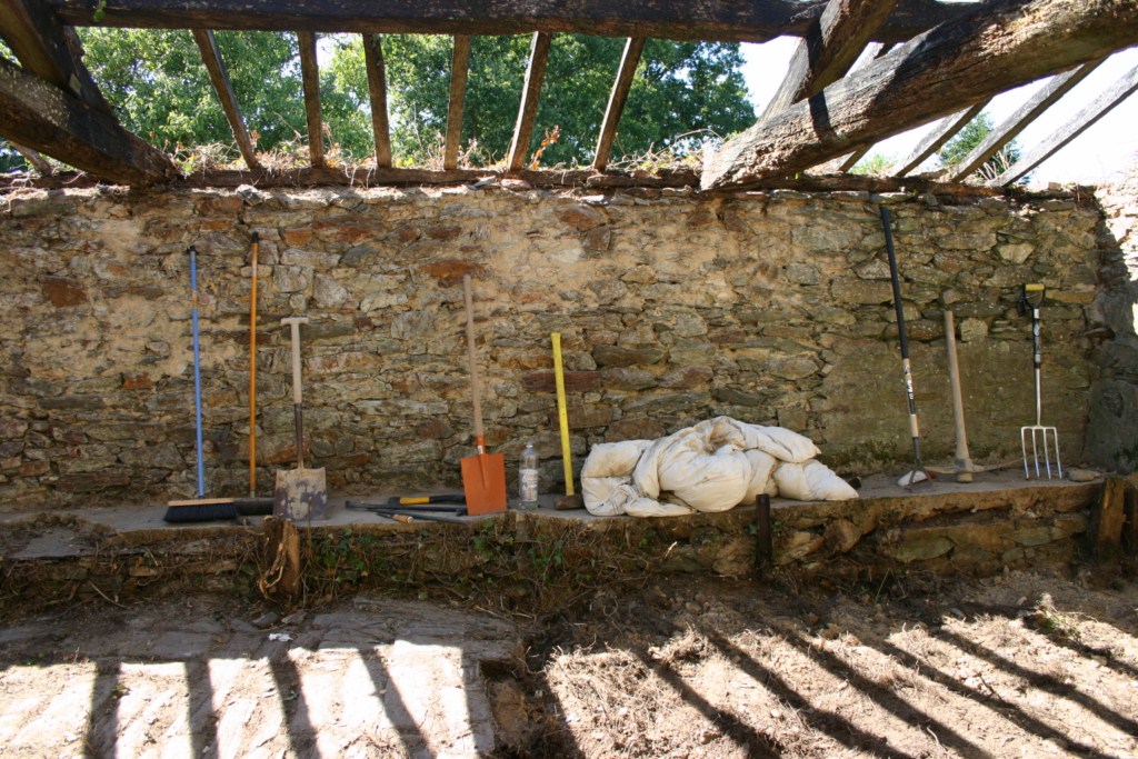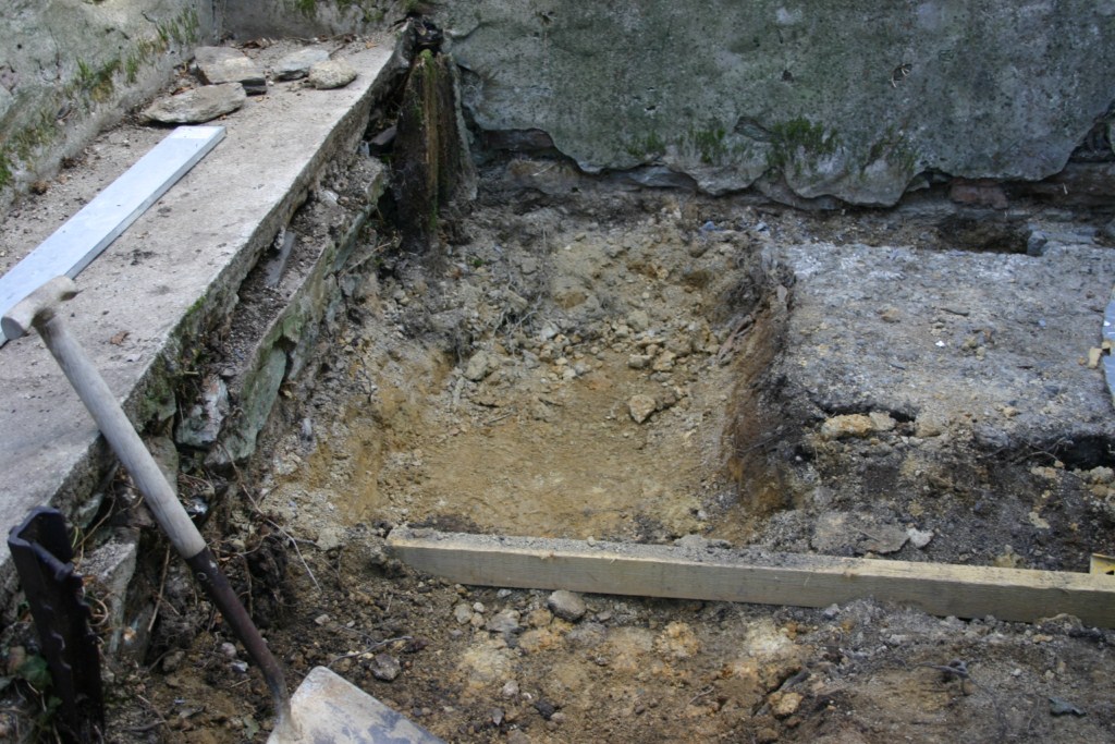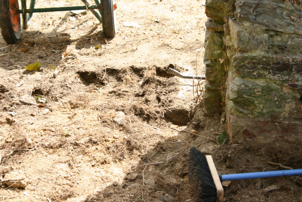 Start work at 09:00 and dig a bit more out. After 3 barrow loads I hit a concrete shelf. I think the whole lot should be like this, a mixture of lime and sand. The loose stuff never set but this did. It's very hard but not like modern concrete. If I try to a break it with the sledge hammer it just leaves an impression of the hammer head. The pick does go in a few inches but takes several swings to break any away. I'm ringing round to find someone who can lend me a breaker. Anyway it's too hot to be swinging a pick!