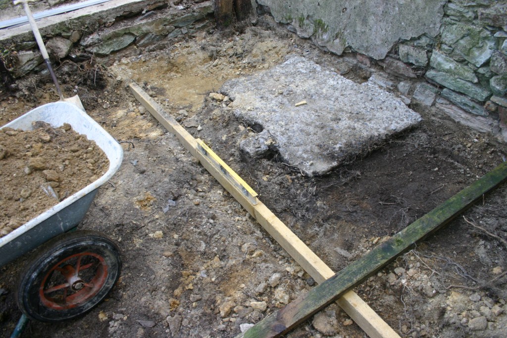 The clay in the new kitchen has turned into a muddy pool due the the heavy rain yesterday afternoon. I need to get a grip and get on, so I set a marker (broom) and that's my target for the day. If I reach it I will have dug out 1/3rd except for the large concrete pad and the bit of earth by the side of it. I need to get the concrete cutter out (is that what it's called?) and cut a large cross so that I have 4 small bits to smash out.