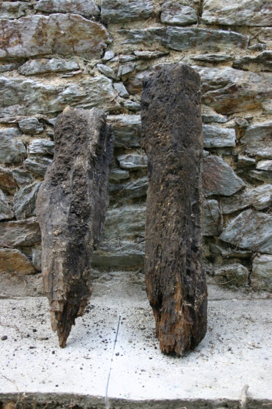 Start with Tom's fork but the ground is too stoney with lumps of concrete (made of sand, lime and gravel). So set to with a large pick-axe. After a while I hit something hard. It's the bottom of a large lump of oak set in the ground just below the surface. I Dig around it and find there's another large post next to the first. So using the pick to drive into the side and lever the things straight up, I get these two posts out of the ground: