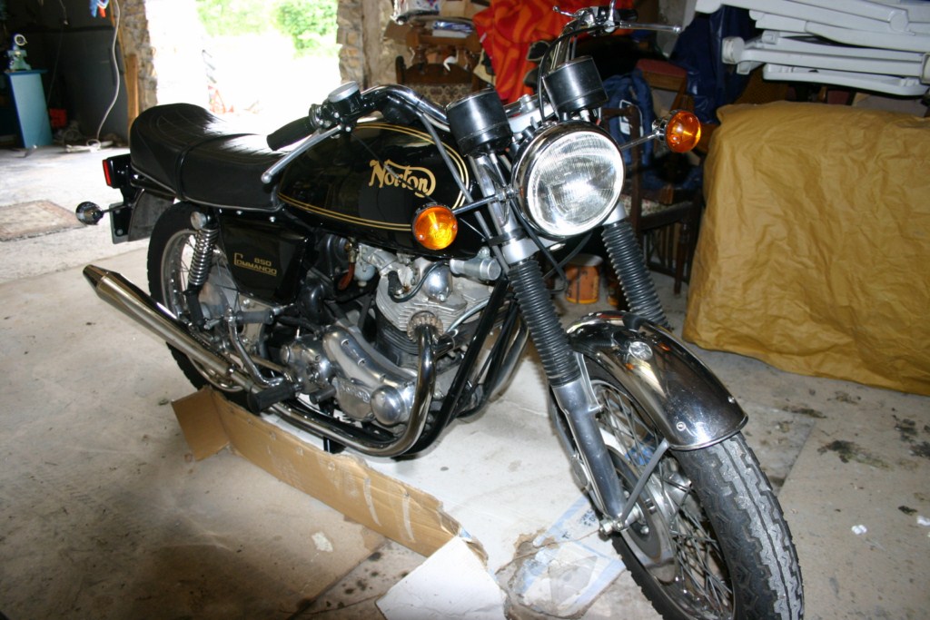 It's a Norton Comando 850 which he bought when he was a trainee doctor. It's in imaculate condition with 58,000 kms on the clock. The picture doesn't do it justice. We've looked it up in the "Book of British Bikes" and it was made between 1974 and 1978.