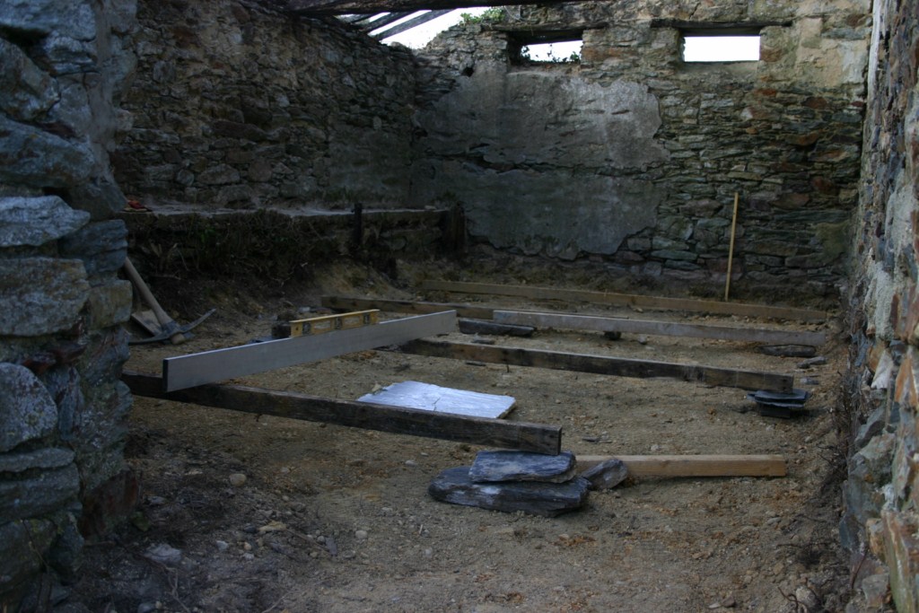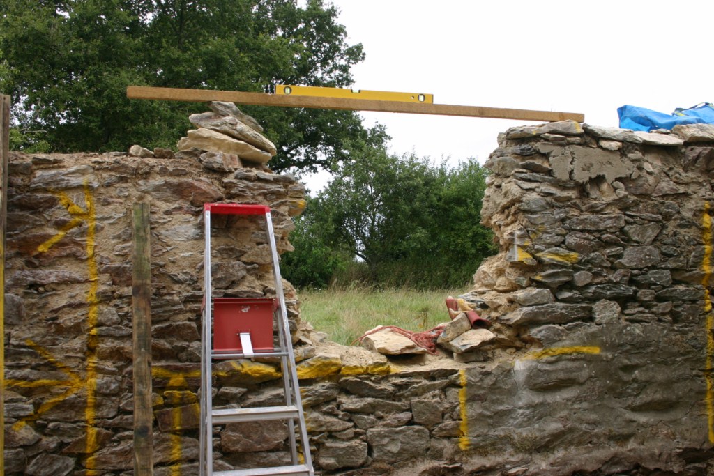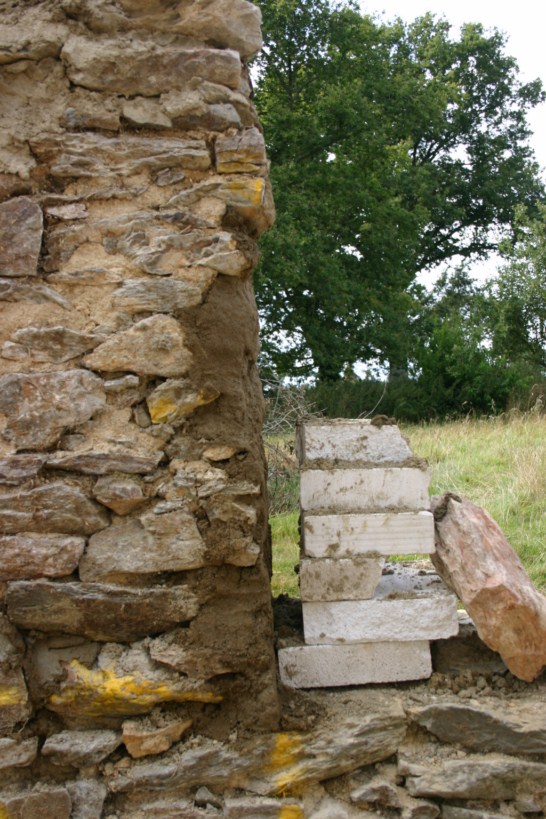 So, plan for tomorrow is to get the matchsticks out and have a good tidy up. Then get the Ivy and the old beam off the top of the wall. I can then break up the plinth and, with the mixer mixing put the stone that comes out on the top of the wall. I would like to go up 6" so the new roof height will be about 8" (2" from the lower floor) higher. I can't go too high as I would like the upper beam to be lower than the old one as I plan to fit a window 60cm from bedroom floor height (so we can look out the window over the field while laying in bed - sad or what?). This is why the side walls will need the angle changing. I've calculated the difference in height needs to be 1.2 metres to give a 14 degree slope. I'll make sure that it leaves room for the window before doing all this - but math's isn't my strong point!
