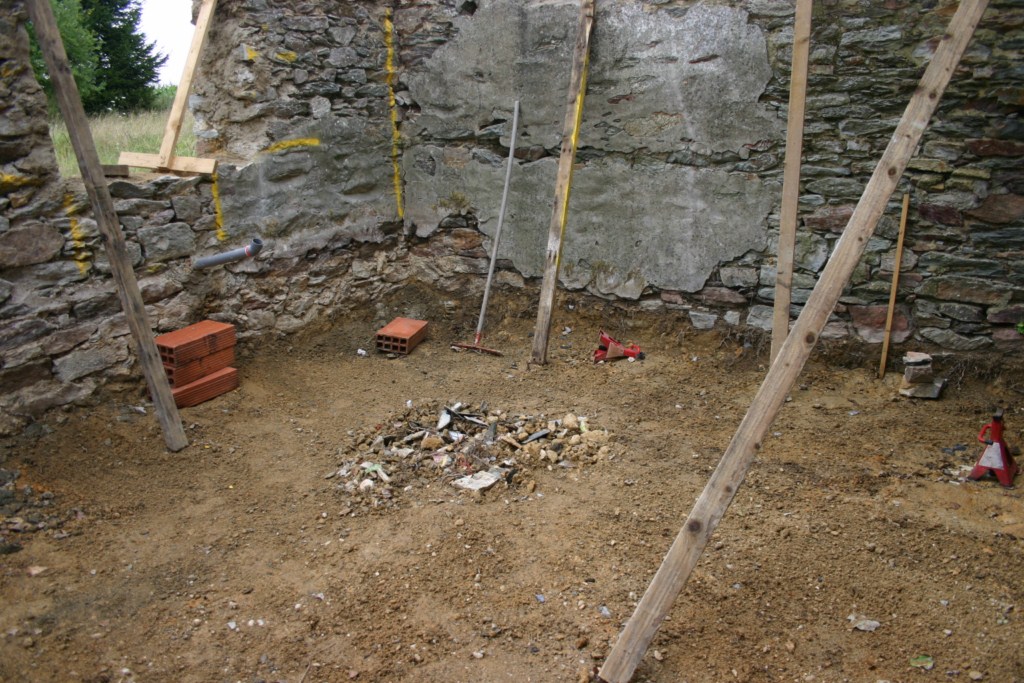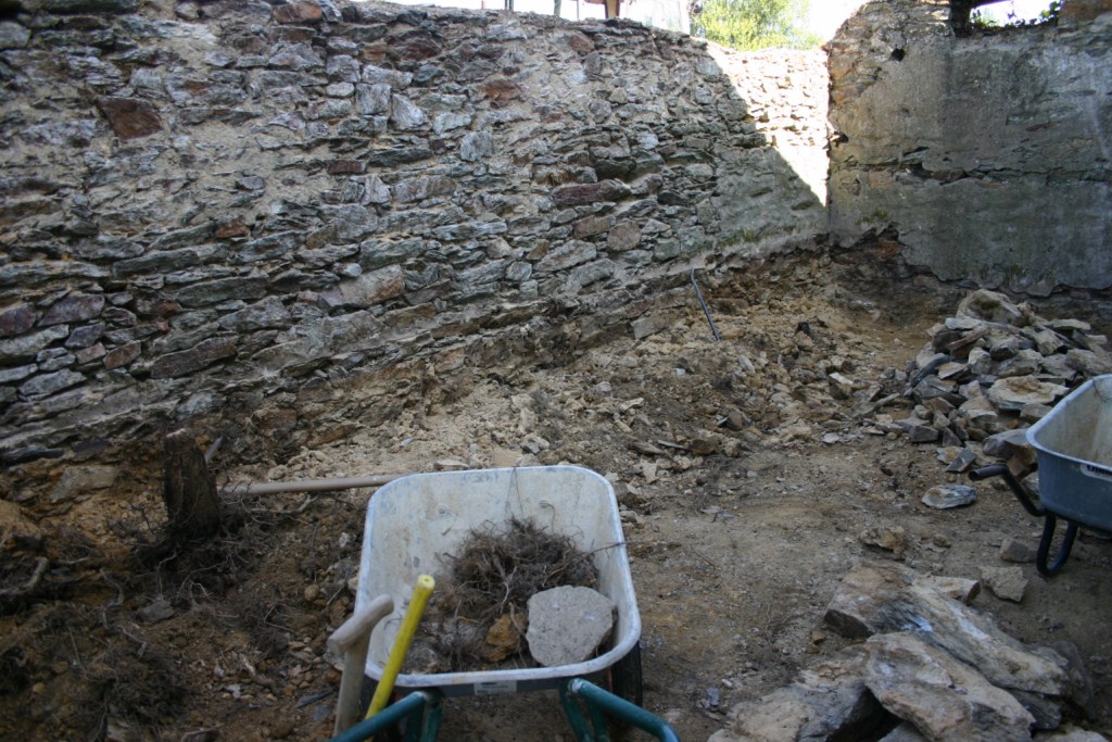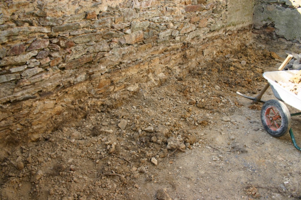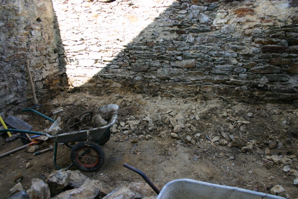Right here goes. The plinth got easier as the stone became more than the sand and lime. A few whacks with the pick and a layer of stone was removed. Along the way 3 oak posts needed digging out and Ivy as thick as my wrist. However this couldn't last. With all (well most) of the stone out and two big heaps - small heap of large stone and a large heap of smaller stone - I hit the underlying mixture of sand, lime and gravel. This stuff wasn't like concrete that could be "broken" but soft. The pick went in with a thud and came to a shuddering halt as it embedded in stone. Very hard work to dig out. tt was like this for about 7/8th of the way, the final 1/8th was hard clay.