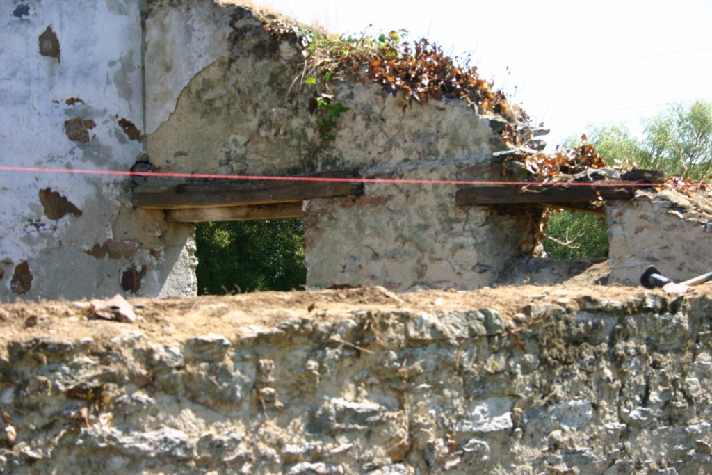 The idea is to remove the timbers so I can dig out the stone plinth and place it on top of the outside wall. This wall was only 2 metres high and I'd like to gain 10cm out of the floor and 10cm on top of the wall to get 2.2 meters. All because the lady .... wants two wall cupboards so I need a few extra inches (what man doesn't).