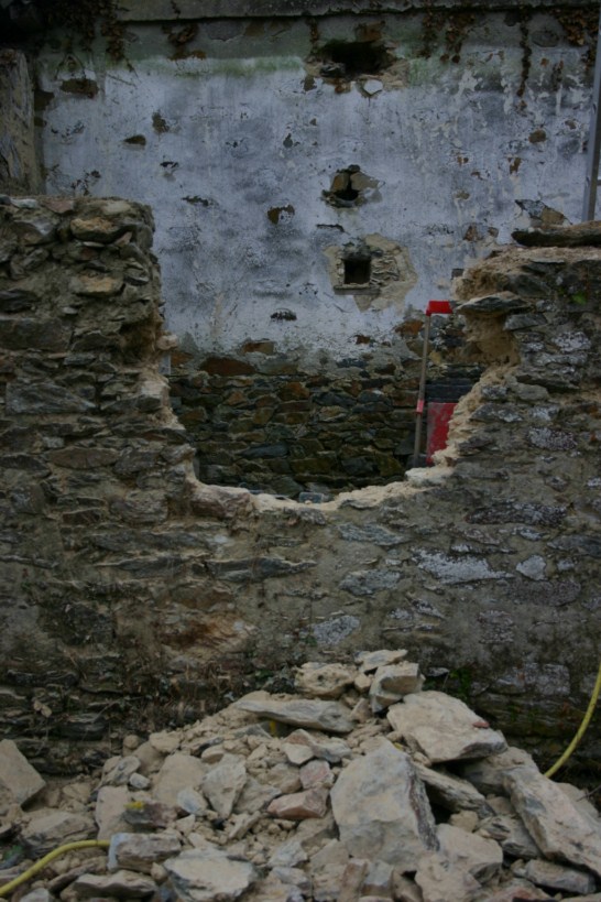 Started by making a mix and shuttering the top corner of the right hand side of the single window (phew). Packed it with stones and poured lots of gobbo in. Then decided to square the top and must have overloaded it as the outside shutter fell away, I swore and just walked away in disgust.