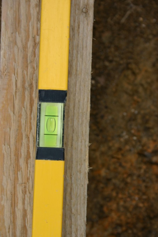 The outside. The white slabs are for a level. There is a red string between the two ends.