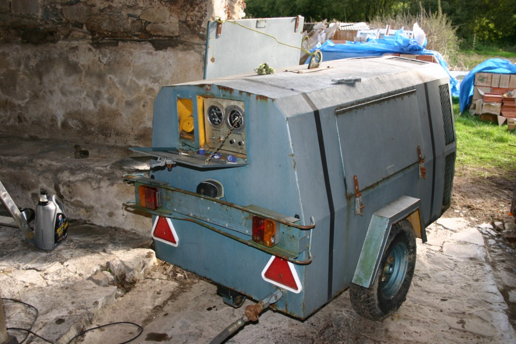 Lynne gives me a hand and we get the wooden division out by turning it end-over-end. Some of the stack of plaster boards are slightly damaged but it isn't too bad. At this point I decide to clear the barn of everything so remove the gantry and ladders. I then bring the old SAAB round and use it to drag the divisions out. By lunchtime they're all out and stacked up by the wood store. I was going to use them for wall decoration but it's only the posts that are oak, the boarding is a softwood and very rotten at the bottoms. After lunch I clean up again and then back the compressor into the barn. I refit the battery, which has been on charge for about aweek and check the oil and fuel. Nothing showing on the dipstick at all so I pour 3 lires of oil in and get it up to level. The fuel tank is almost full. OK, press the starter and it churns over a few seconds at which point the battery seems to be giving up. I try this several times and it fires. But then cuts out. Several more starts and cut outs and I decide to get the thing level (It's leaning over a bit as the floor isn't level due to the "crown"). Lynne helps by driving the SAAB and we get it onto the top of the "crown". It's still cutting out so I try opening the air valve. Success! it runs up and is fine. OK, shut it down and connect the pipe to the blaster. last year I had put the only rubber seal I have on the ledge in the kitchen with strict instructions that it was not to be moved. Guess what - it's been moved. Counting to ten I ask Lynne where she's put the bit of rubber that was in the kitchen, fully expecting a "It's not mine, I haven't touched it, it's all your fault" However, I'm wrong. She goes to my desk draw and produces the seal like a genie out of as bottle. I fit it and the pipe is sealed and airtight. The nozzle isn't blowing much air but I'll sort that out in the morning as I can hear the bar calling so get showered and go for a quiet drink.