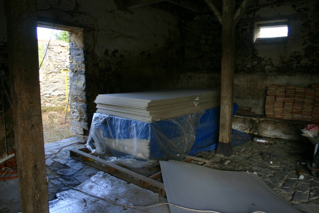 This is the plasterboard that was moved into the garage. The hand made clay tiles can be seen on the plinth to the right of the plasterboards. There's another stack on the plinth opposite. They're all in the garage now.