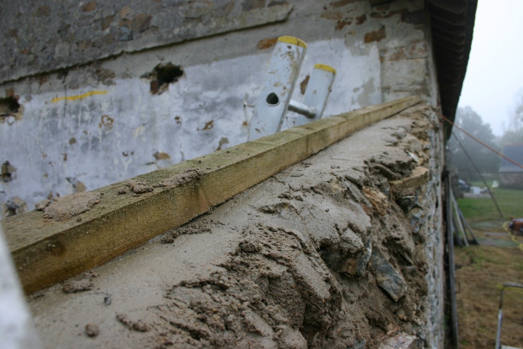 Having moved the plasterboard, which took a whole day, I started on the end walls of the lean-to, which will be the kitchen. I want to lower the slope of the roof so I can get a window in the barn gable end at about 2 foot of the upper floor. This is so we can lie in bed and look out across the kitchen roof over the fields to the west.