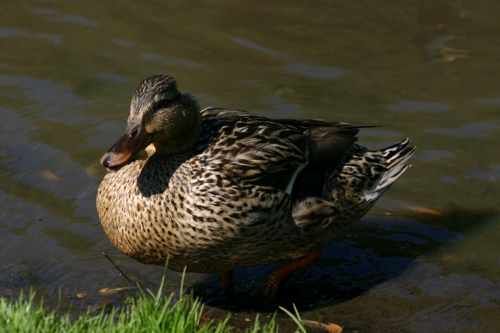 She got up to prepare lunch and she went in, she came straight back out as she noticed a movement under the duck by the door. There was an egg, broken in half, with a duckling emerging. We watched for a few minutes, took some photos and carried on with lunch. After lunch she noticed something on the pond and called me to see two large frogs sitting on the water. As I approached the pond a slight ripple announced the arrival of a snake. Yes, a snake. It slithered off the bank, into the water and swam across the pond to the overgrown bank on the opposite side. So, in the space of an hour we had new ducklings, two frogs and a snake. All we need now is for baby Coypu to arrive. I'm sure the adults are having young as they are in the pond but not showing themselves.