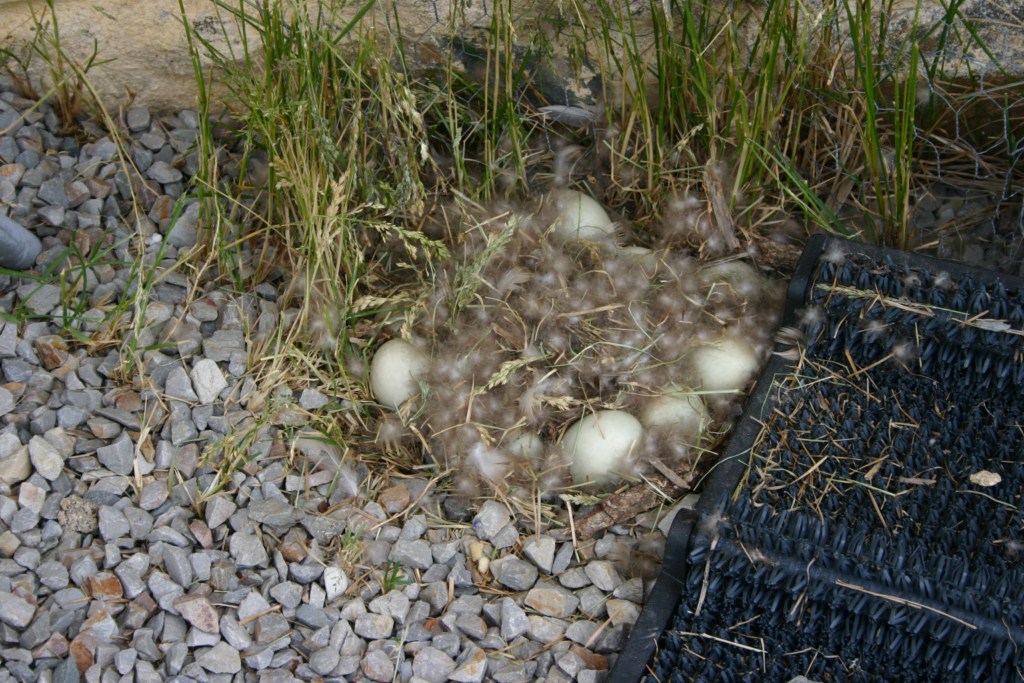 To catch up on other news we have two ducks nesting, one right outside the front door and the other a little further along the front of the house. The duck by the front door has 16 eggs and the other 12. The duck with 12 eggs started hatching on the 19th and took two days to get 4 hatched. That was it, the other 8 were sterile.