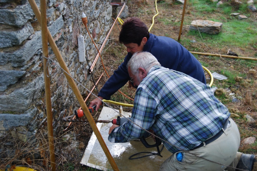 Deep joy! We drilled 3 holes in this wall then a fourth into the barn (this is going into what will be the kitchen - 1 hot, 1 cold and 1 gas) Half way through the second hole into the barn (for feeds to the bathroom) the drill snapped at the shank. Now waiting for a new drill to arrive in the post. (30th Sept). Picture courtesy of Mark Williamson from the Westfield club.