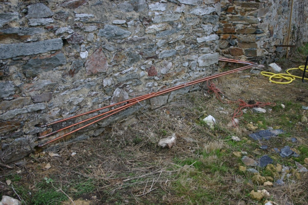 The broken drill in the now aborted hole which broke it. The first hole has a copper pipe through it.