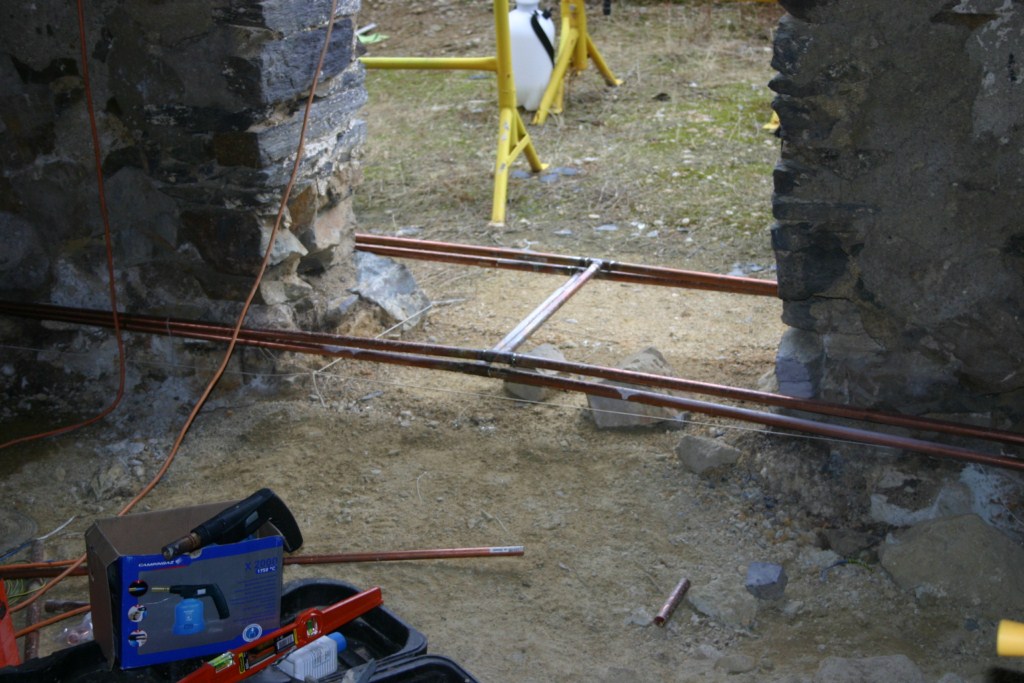 The central heating pipes coming into the lounge from the kitchen. It's very bright in the kitchen due to not yet gaining a roof.