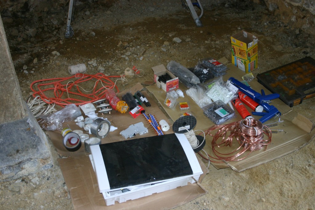 All the bits and pieces laid out ready to install. To the right of this lot is 300 meters of each of the colours 2.5 mm cable plus 200 meters of 1.5 mm.. If only one could wave a magic wand.