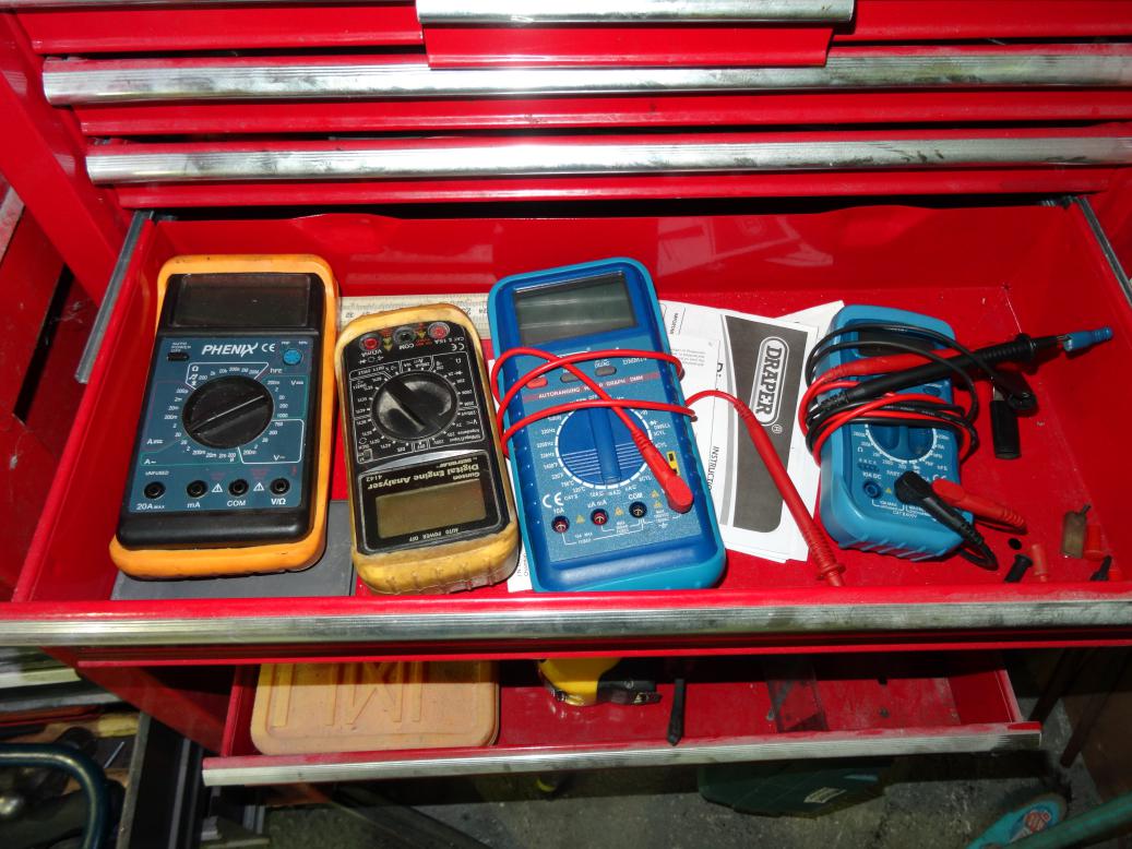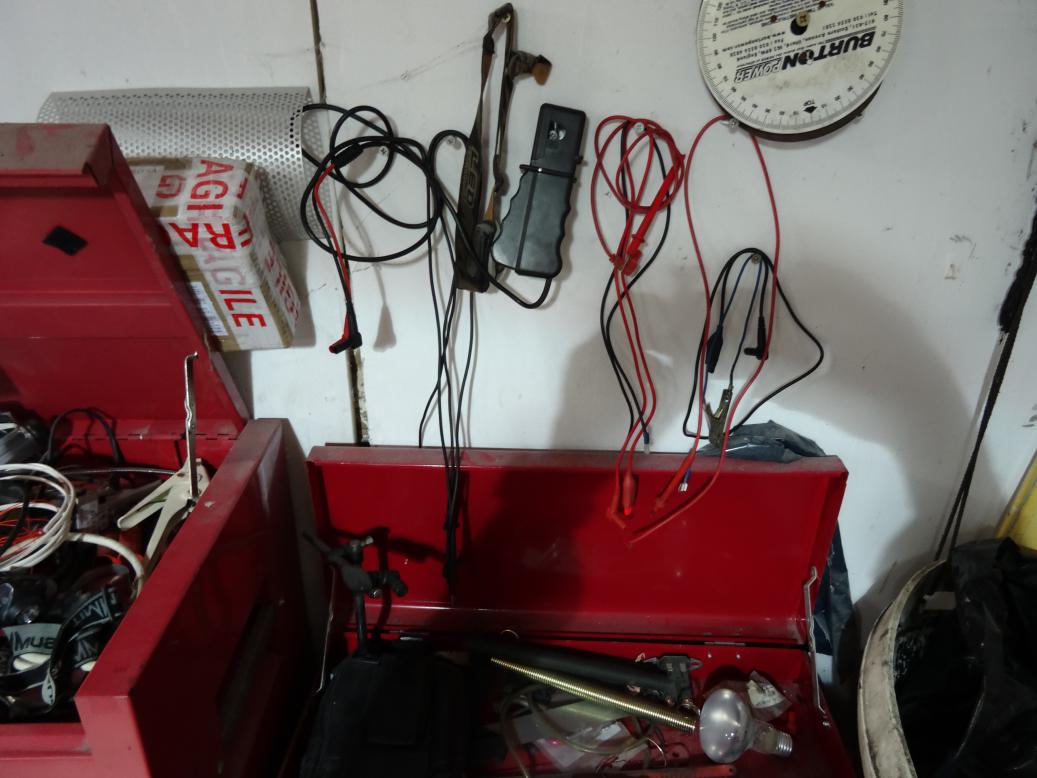 This is the top box of one of the two small tools boxes (purchased in the last bulk buy from China). Some odds and ends and the multimeter connectors hanging up.