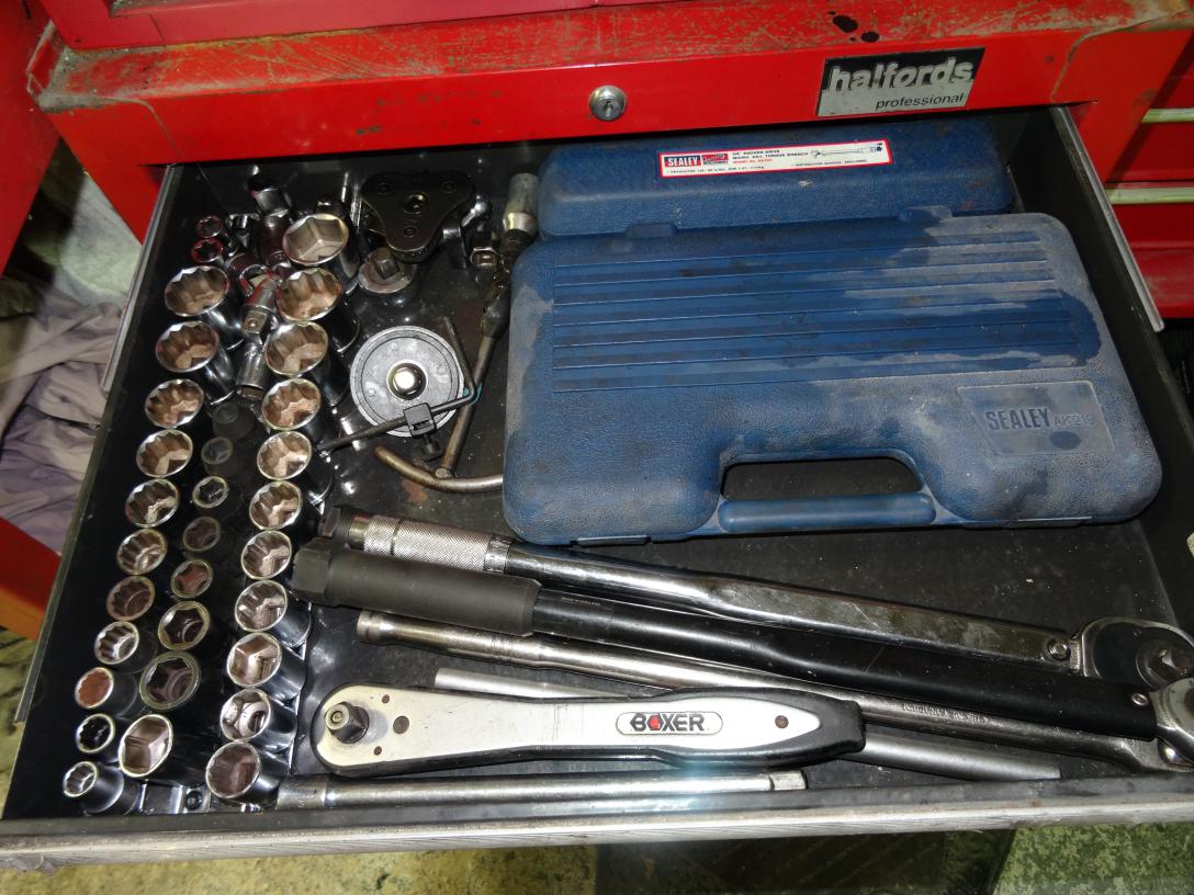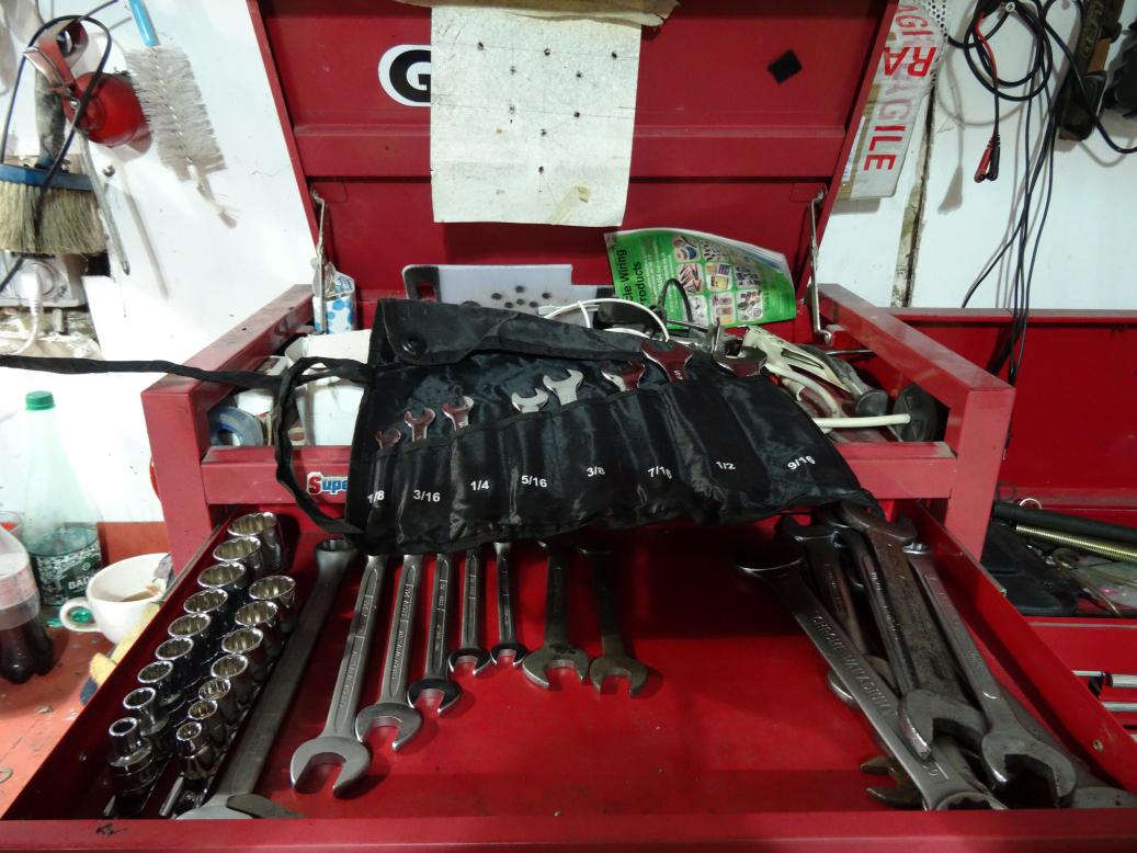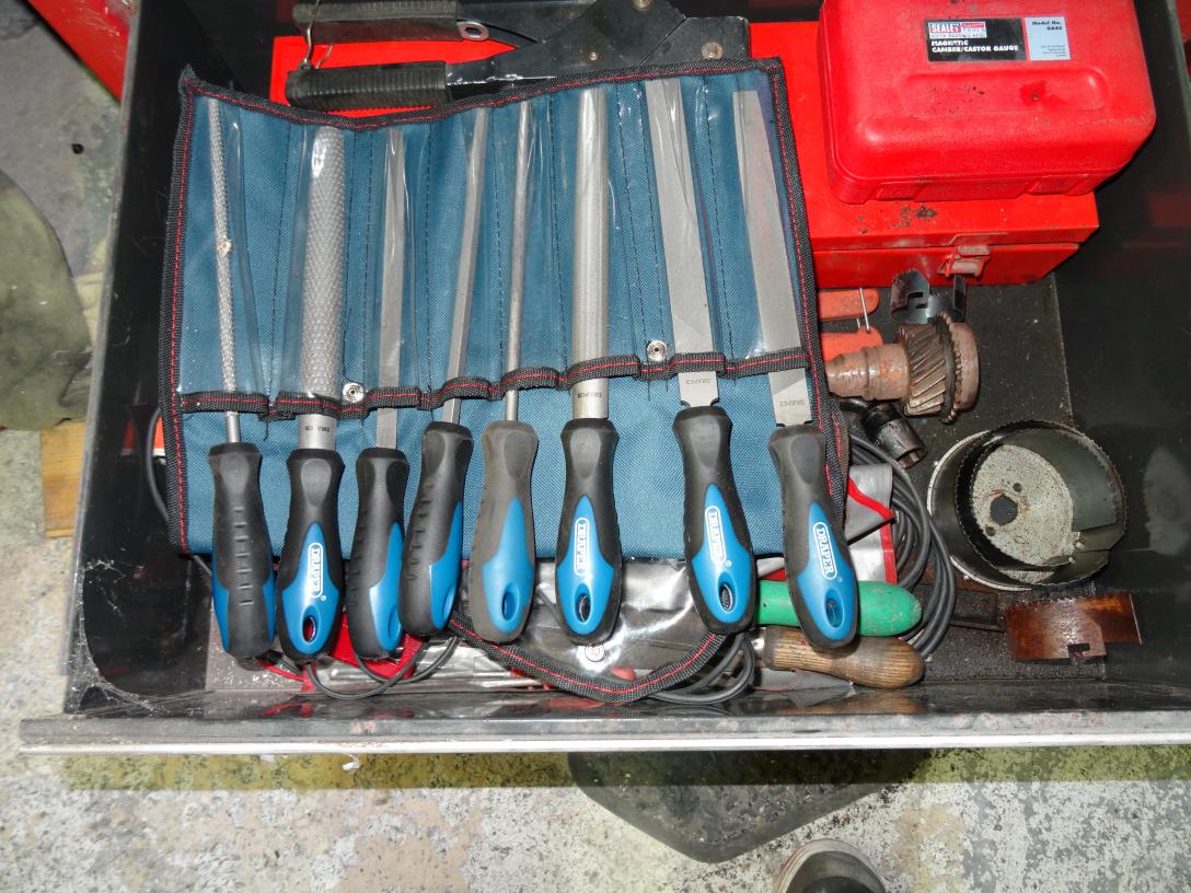 Files. Under the files is a timing light, a first motion shaft for a Ford Type 9 gearbox and more files. The red boxes are a 1" socket set (up to 50mm) and a camber angle tool.