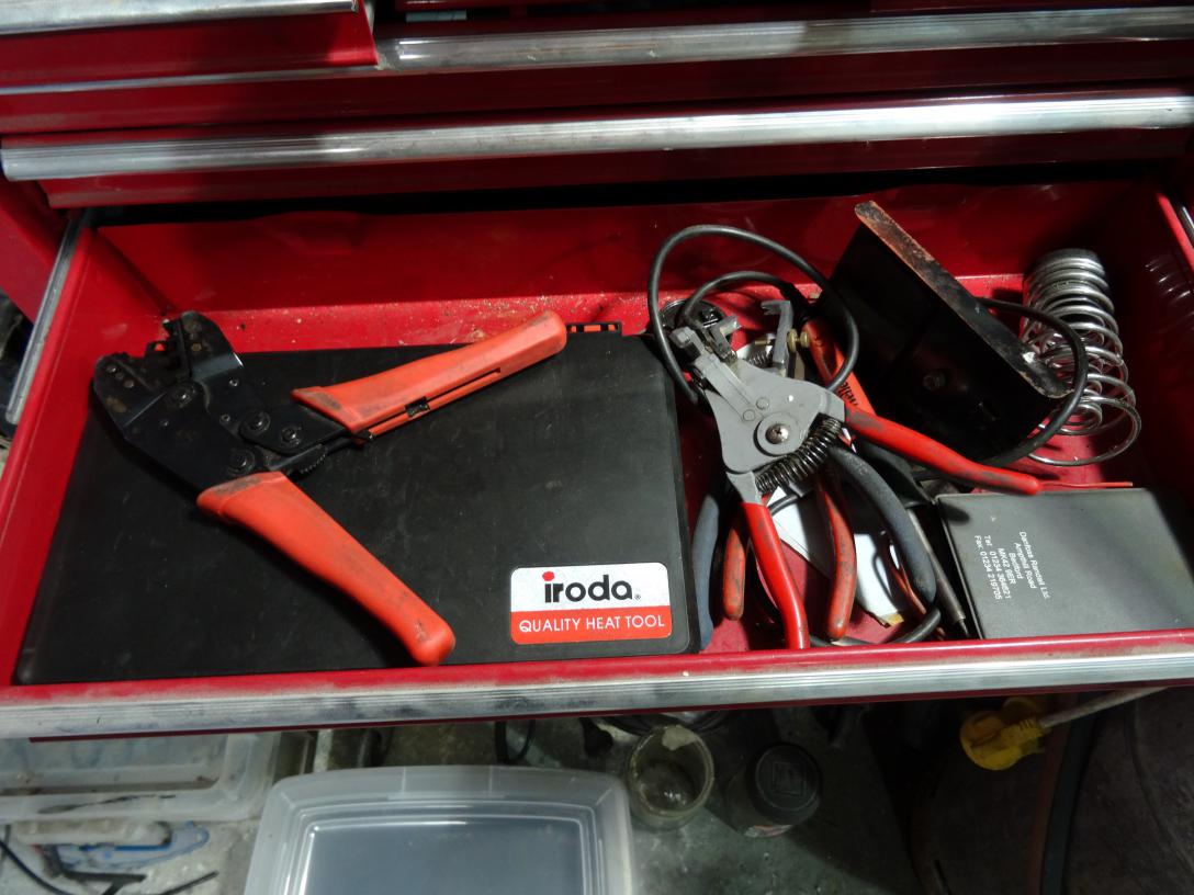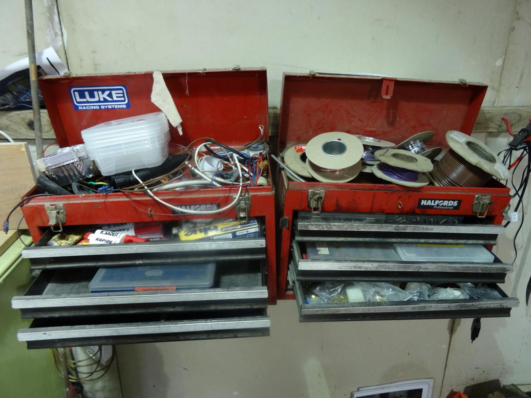 Two tool boxes hung on the wall. The wire stock is kept in the top and the draws have glues and gasket cements, various boxes of grommets, springs, fuses, wiring connectors, packets of multi wire blocks and terminals, a draw of off bits of metal used as brackets etc.