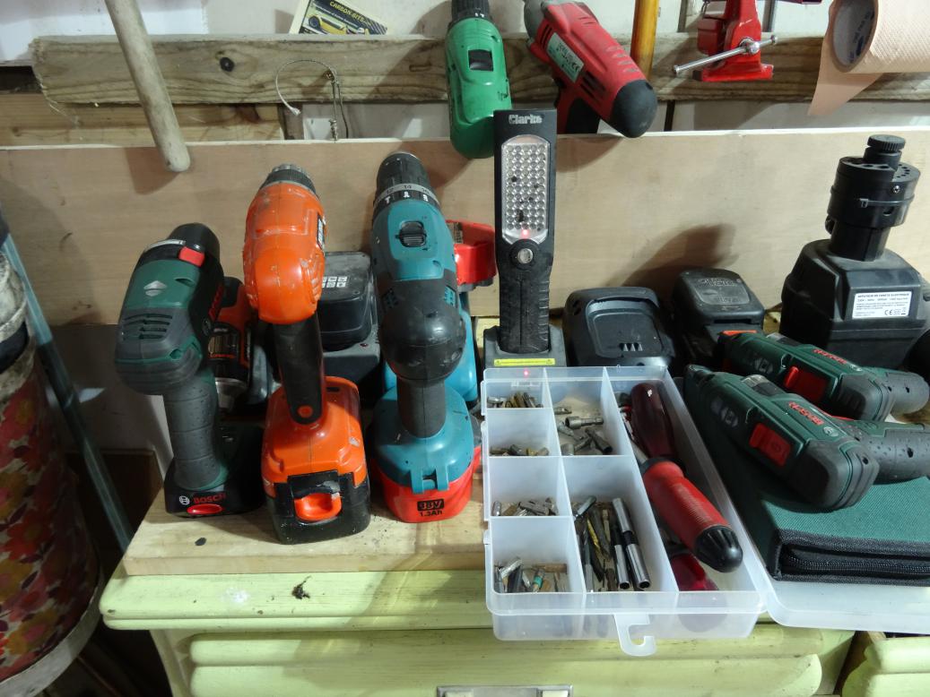 The charging station with drills, led lead light and two screwdrivers (one in use, one on charge.) The plastic box has a huge assortment of screwdriver bits.