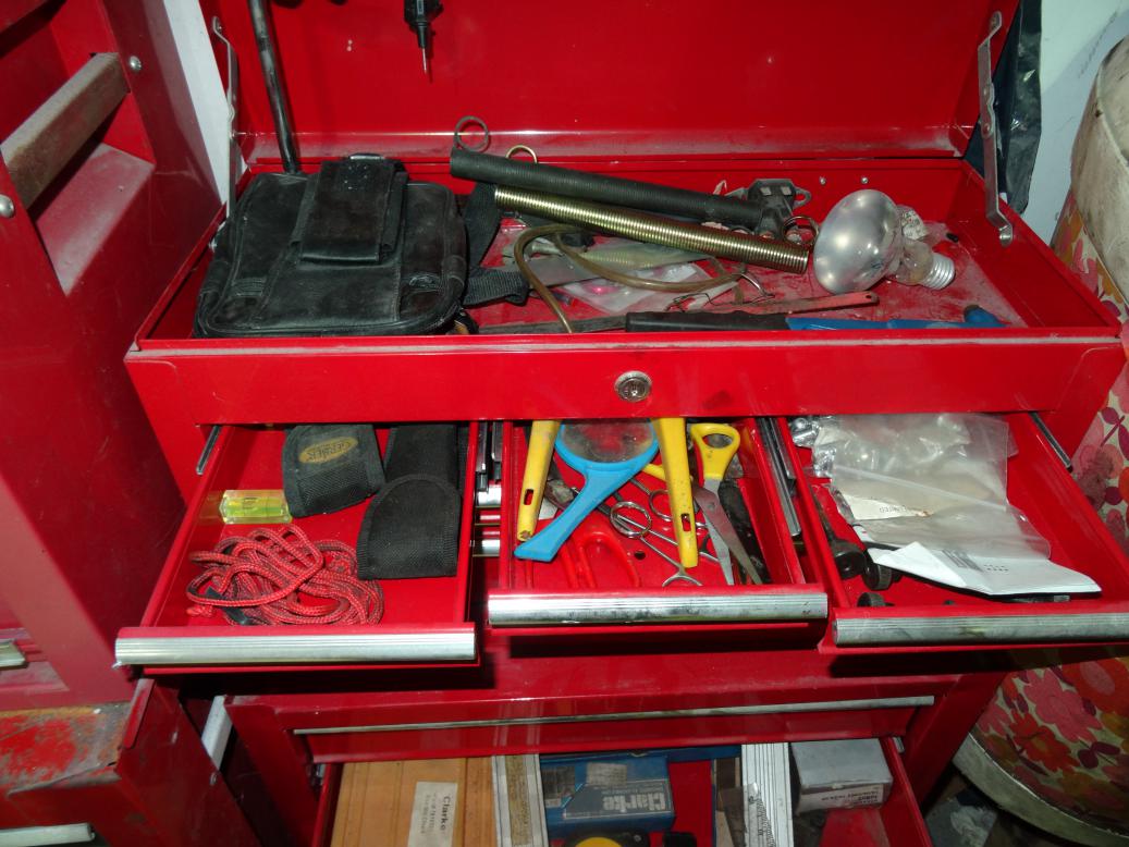 Three small draws with (l-r) multi use tools and a plumb line, scissors and scrapers and rivnuts.