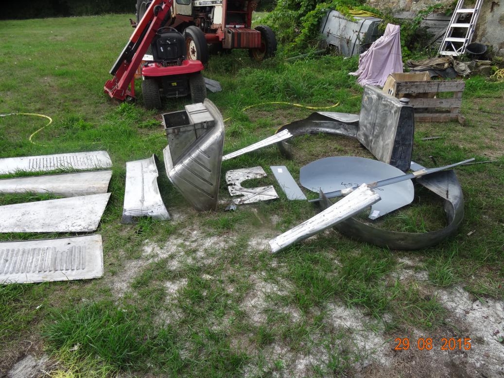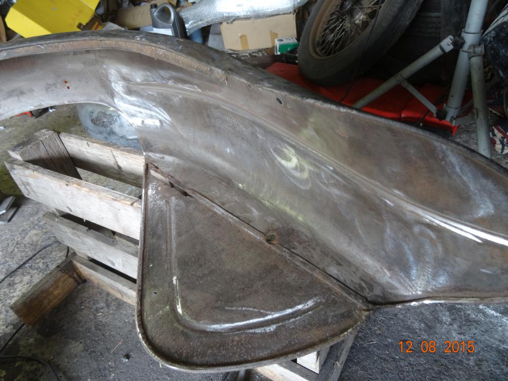 I took these pictures last night as I waited for it to cool down from the raging 30c we had during the day. I got all the panels out to put in the van we're going to Portsmouth in to meet my daughter and son-in-law who will be collecting it from Lancashre on Monday. You may be wondering why I'm taking the panels in the van. Reason is that we return at 1500 on Tuesday and I want to get the tub and panels to the bodyshop that night. It's 3 hours from Ouistrham to the bodyshop so I'll take them with which will save time on the return. I can drive straight there. They close at 1900 so I should catch them. It will save a days van hire. The front wings are already at the bodyshop and I saw a chap working on them yesterday. He had made up new flitch plates for the leading inner edge of the wing tip and had soldered the holes where the wing mirrors where. He's also panel beaten the few dings and dents in the wings. Looked good.