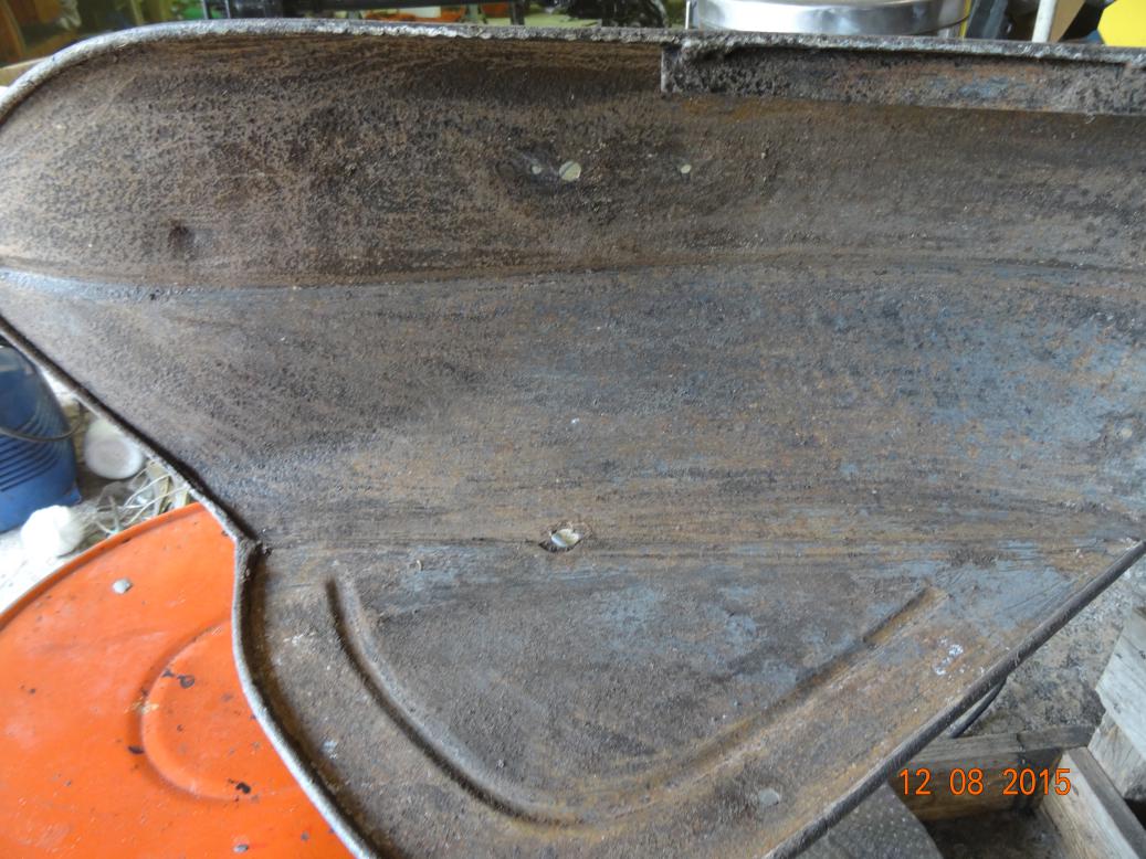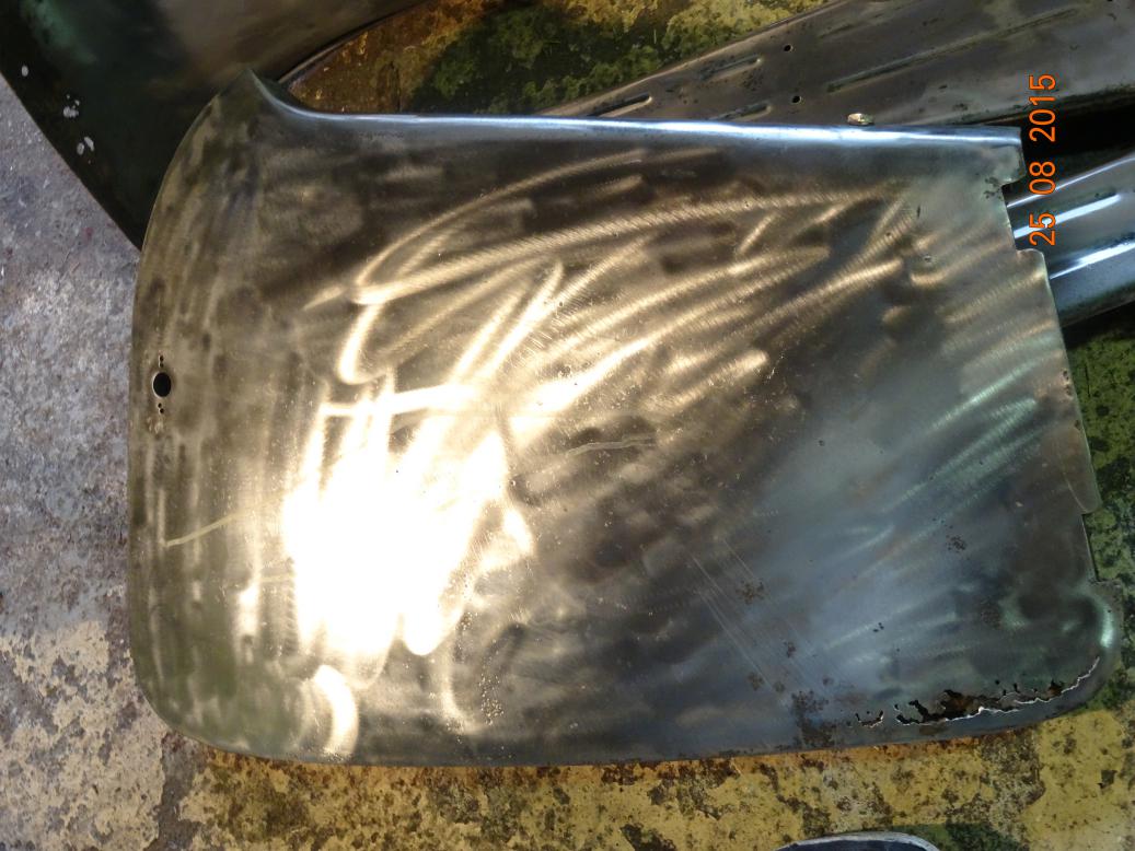 Started fairly early at 0830. Carried on with the front apron and spent about an hour and a half scraping away in all the corners and Louvre's to get the paint off. Then ground off the rivets holding the rubber strips to the running boards and got the paint off them. One is badly rusted at the front edge as is the other one, bit not so bad. Next came the inside of the bulkhead. Then lunch. After lunch I did the spare wheel carrier. This will need a bit more attention, probably have to rub it down with emery cloth by hand. I have tried sandblasting it but the specs of paint will not come of with the sandblaster. I also sand blasted the two straps and then gave them a good coat of paint stripper, scraped them again then gave them several coats of phosphate. Whilst I was waiting for the paint stripper to eat into the paint I scraped the rust and grease off the transmission tunnel. I will get this de-rusted and clean as best I can and paint with POR-15 as it's not visible with the carpet over it. Last job was the petrol tank. It's 99% done but I've run out of scouring pads for the angle grinder, that's 6 used in two days! So, sort of finished the paint removal. I'll get more scouring discs and clean the phosphate off the panels I've done this week as well as finish the petrol tank. Then weld the plate on the tank and then I can get the brakes and hubs on the chassis. I reckoned on a week or two to strip the panels, it's taken..... 7 weeks (since 7th July). I've had a few odd days off and a week off when Tanya and Paul were here but it's taken a lot longer than I planned.
