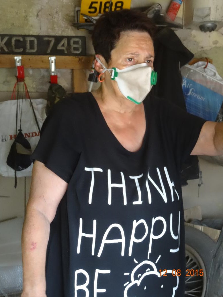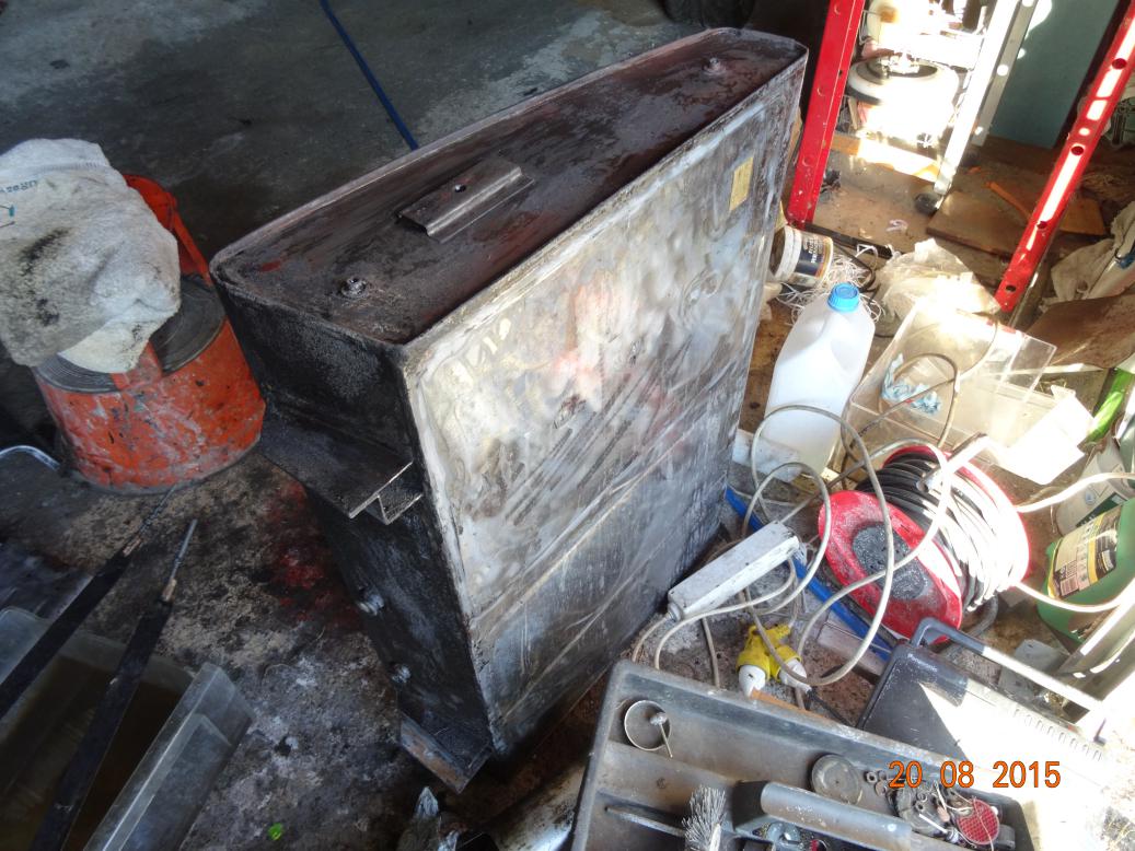 Get back at 1130. Build the oxy-acetyline plant, drain the petrol tank of the degreaser and set the hose running to flush it. Then get all the panels to be done out along with all the tools and the discs and brushes. Paint the two doors with paint remover and break for lunch. After lunch scrape and scour the doors to the metal, treat the tank to stage 2, which is a litre of phosphate and 1 litre of water, then carry on with the front apron. I am turning the tank every 15 minutes and after 2 hours I drain and flush the tank. I then remove the feed pipe and the drain plug along with the fuel tank unit