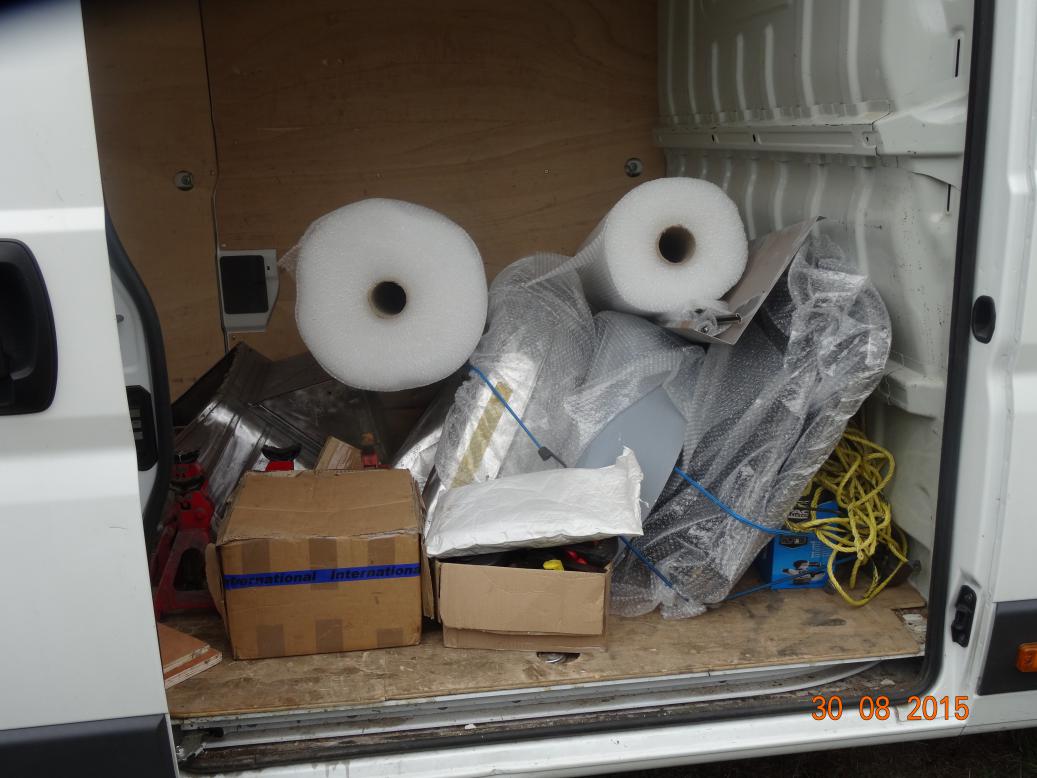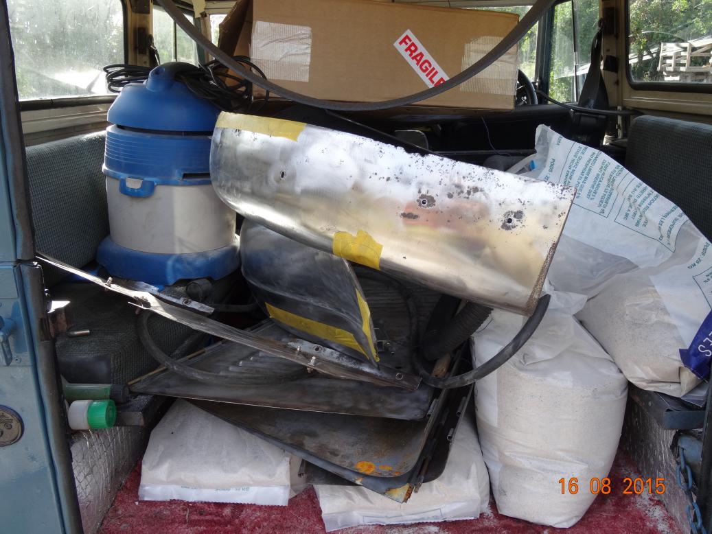 It's now Sunday morning at 1100. I started at 0800 by mixing the resin for the tank, pouring it in and then "rolling" the tank around the field for the next hour to spread the resin all over the inside. Then at 0900 I took all the panels out of the van, wrapped them in bubble wrap and repacked them tieing them down with bungees. When that was finished I loaded the van with books, nuts and bolts for the body, the new rubber strips for the body and the chromed windscreen frame. I hope they have enough to do the job as I don't want to be spending time going back with litle bits they may need. Remember they will not have seen BSF threads before.