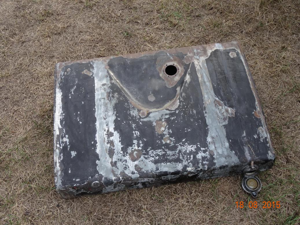 I worked hard all day and achieved nothing, or so it seemed. I had run out of paint stripper (or bum burner as we call it). So decided to sandblast the petrol tank and a few other bits which, I thought, had no paint on them. Wrong, they all had paint. But I did find a rust hole at the bottom of the side of the tank. I cleaned the surrounding metal with a flapper wheel and made a metal plate to weld over the hole. Took the tank into the workshop (after filling it with water and draining) and went to light the oxy-acetyline torch. It wouldn't - it had run out of acetylene