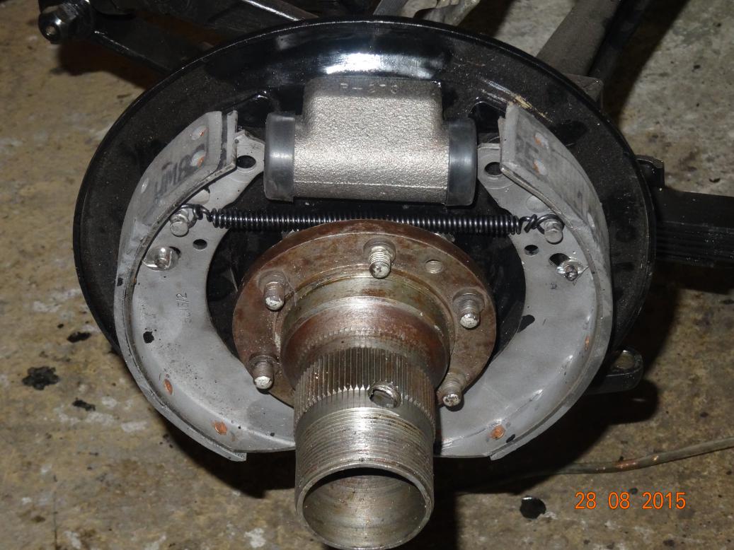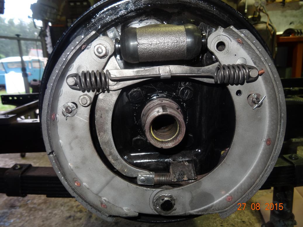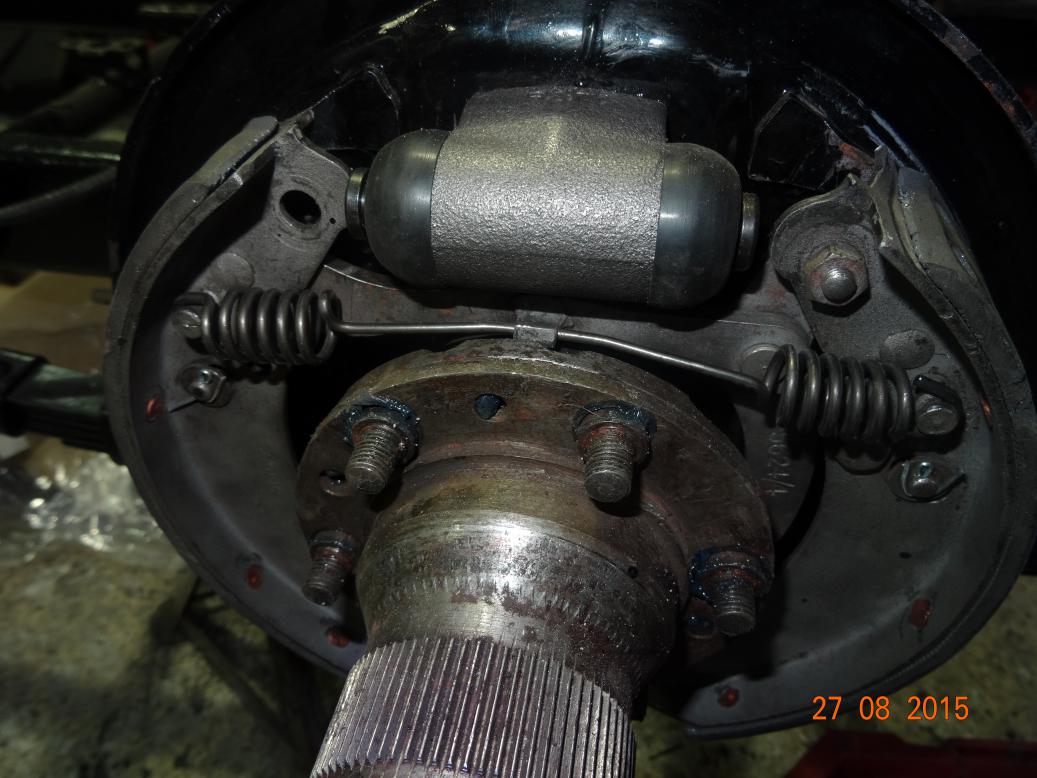 And this was about 1500. I got the hub and half shaft on but the drum wouldn't go on. Looking at this picture it may well be the hand brake cable, being routed incorrectly, is pulling the expander open. You can see the cable at the bottom and I think the end should be more to the right.