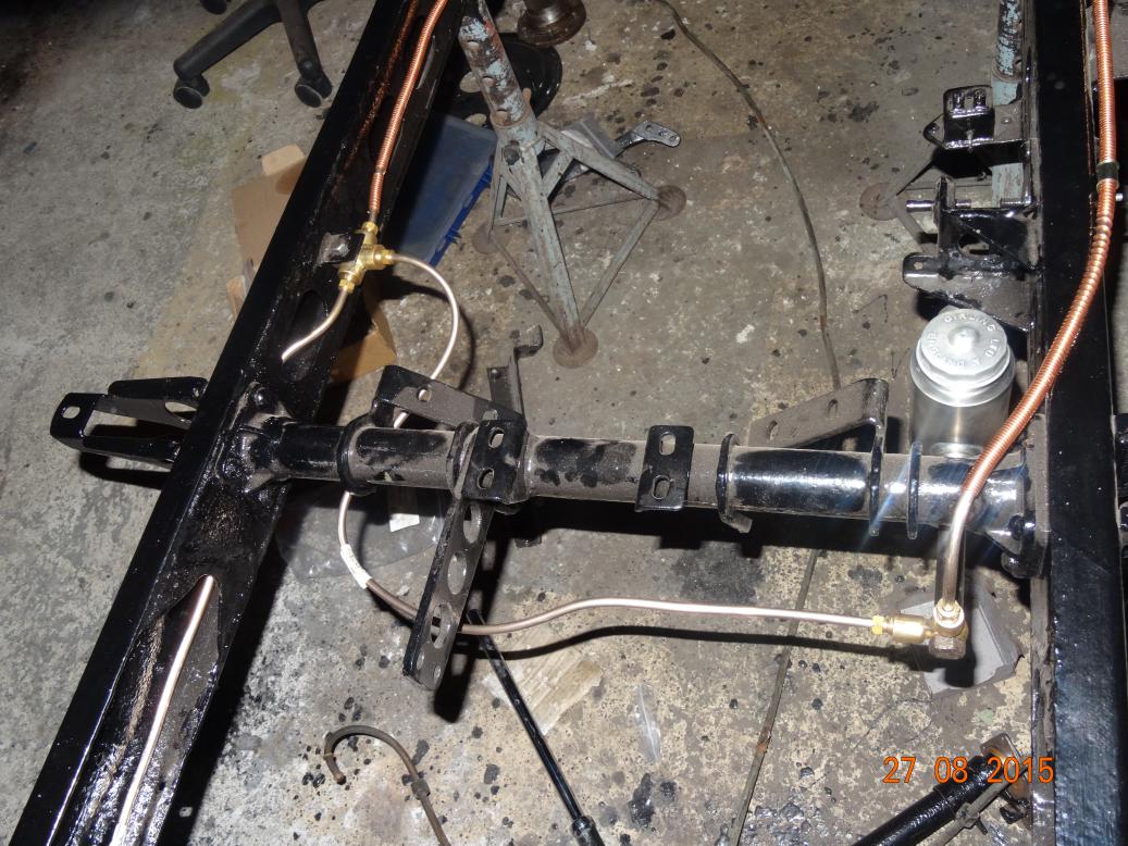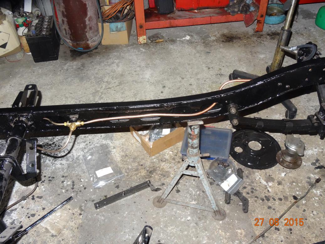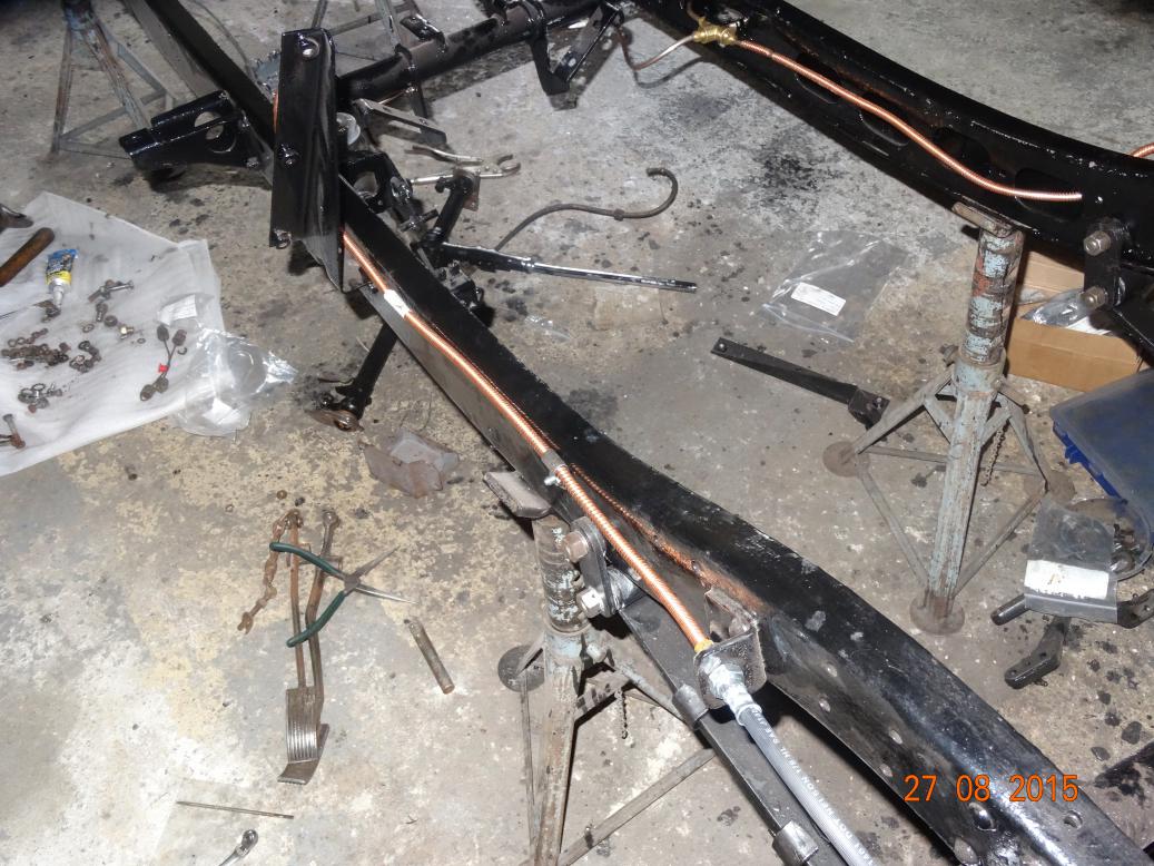 I spent the afternoon running the pipes and clipping them to the chassis. I'm concerned about the routing of two of them. The one that goes from the three way on the near side front, across the chassis, under the gearbox to the master cylinder and the route I've put the pipe from the master cylinder to the O/S/F. Time to ask the font of all knowledge, the TABC group.