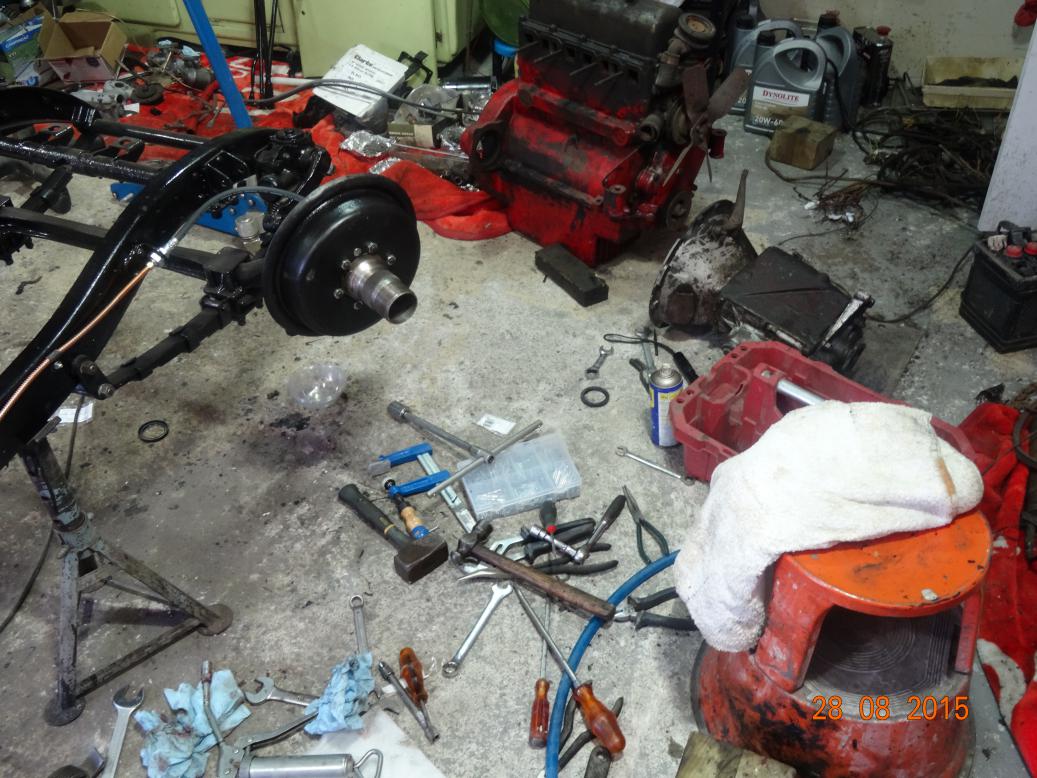 When I got back I finished off and got the wheels on and the chassis on the ground. I now have a rolling chassis with 3 brakes as I'm waiting for new handbrake cable which will probably be here on Thursday. Anyway, while they get on with the body I can do the engine and gearbox.