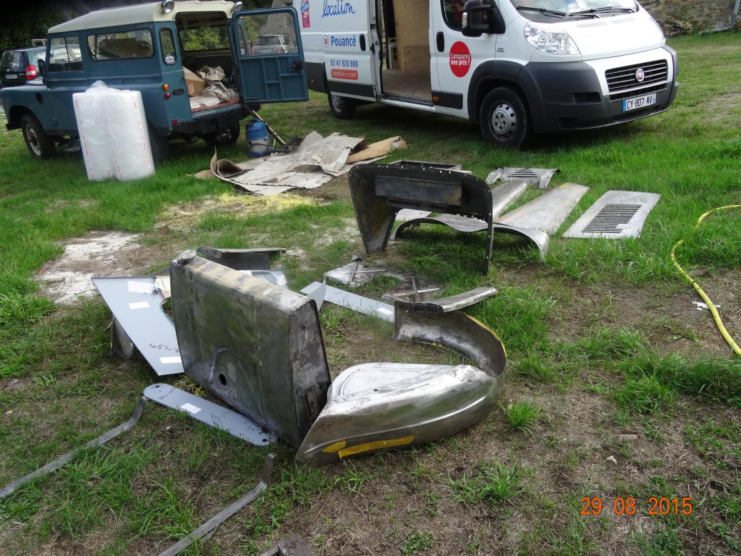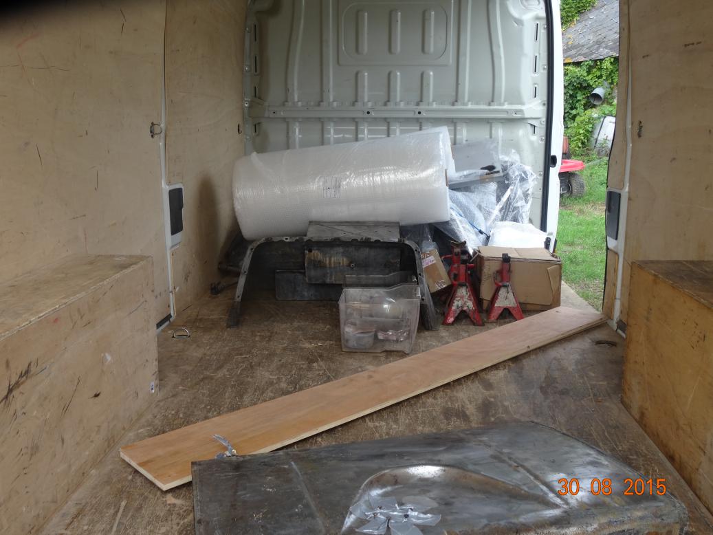 All the panels laid out. The front wings are at the bodyshop already. Note the large van I've hired. I wanted a "normal" Transit sized van but they don't have one at our local Super U supermarket. I could have got one in the next town (Chateaubriant) but couldn't be bothered with the extra trip back and forward. Turned out OK as I now have more than enough room for tha panels and the tub. The two large rolls of bubble wrap, by the side of the Land Rover, will be used (this morning) to wrap all the panels in. Don't want any more damage! The tape on the raer wings marks the damage/rust that will need repairing.