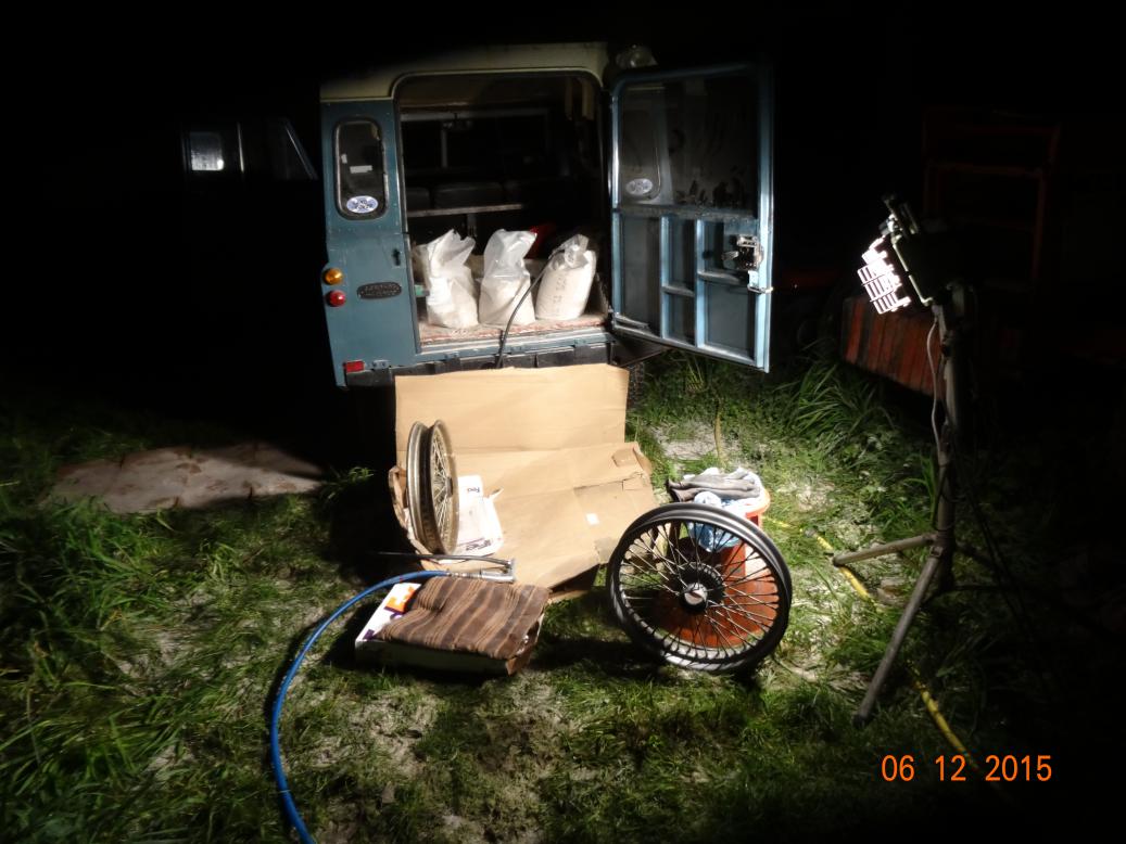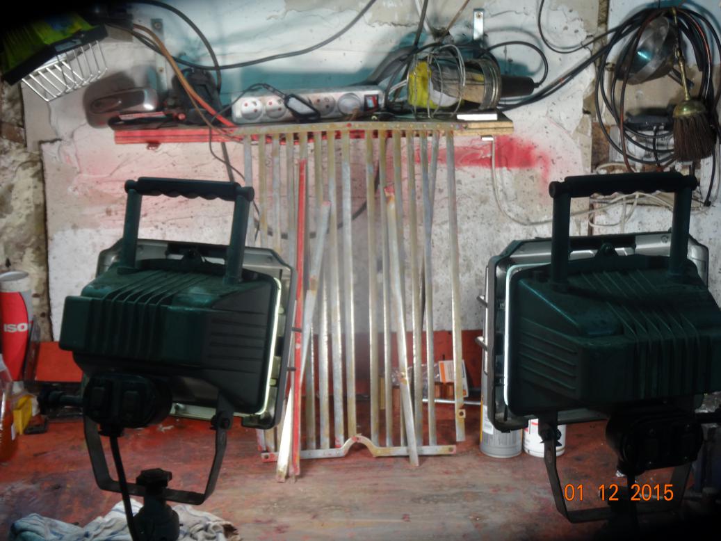 I had breakfast and went over to the workshop at 0600. I got the floodlights out and set everything up and started blasting at 0615.I had a few problems, the pickup pipe kept getting blocked and at first I thought the sand must be damp. Then it dawned on me. I'd been shovelling the sand back into the bag and the shovel was scraping bits of cardboard up. I sieved all the sand and it worked a treat after that. Still could only do ten minutes blasting and ten minutes for the pressure to build up again. I finished at 0930 and cleaned and tidied up. I had the four wheel on boxes under the arc lights and a paraffin heater going. I applied the first coat of primer to all four wheels on the outer side at 0945. Half hour later the second coat goes on and at 1045 I turned them over and applied the first coat to the inside of the wheels. During the breaks between coats I've started bringing all the rubbish out of the garage next to the gites.... and typing this up. It's now 1115 and the second coat is due.