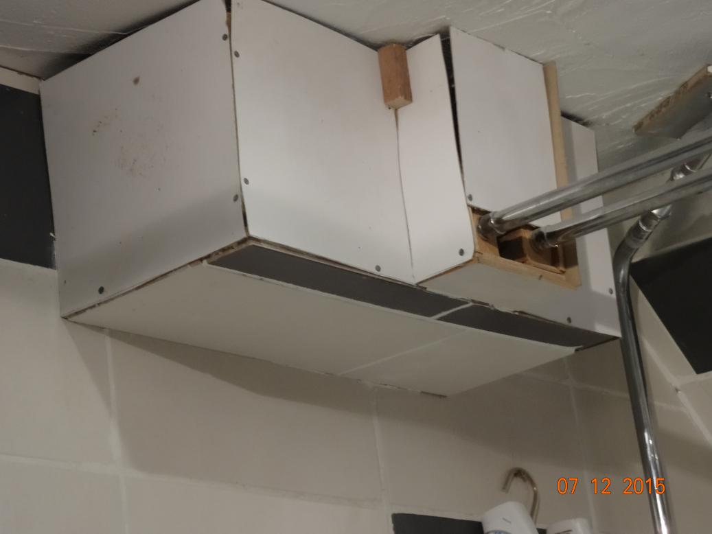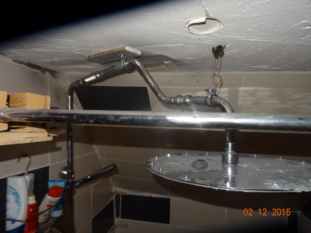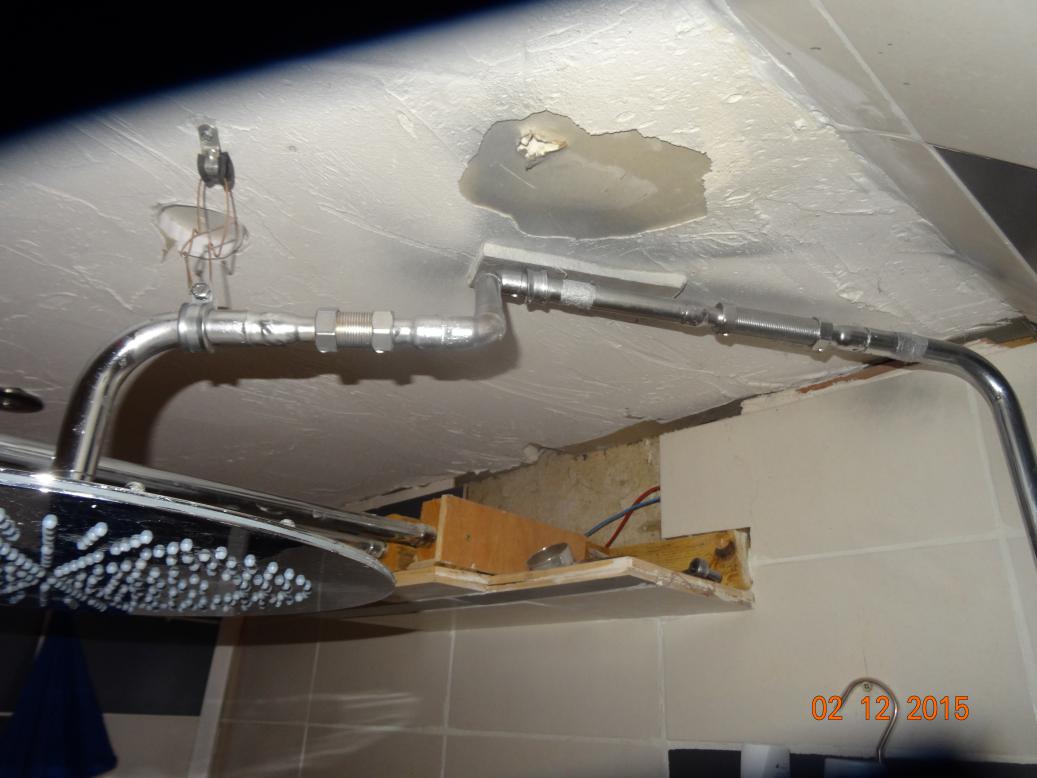 From the other side. The drips aren't water but paint, I just sprayed like a mad thing. The patch is where the previous leak was sending a very fine jet of water to the ceiling and it went soggy and fell apart. I bonded the patch on and fitted a plasterboard fixing to hold the "P" clip which supports the arm.